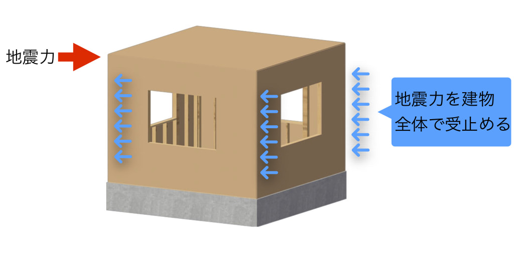 一般的な木造軸組構法の筋交いを無くし、代わりに構造用面材を用い強固な六面体を構成、地震などの外力に対し六面体全体で抵抗します。外力が分散するため変形しにくいのが長所です。
