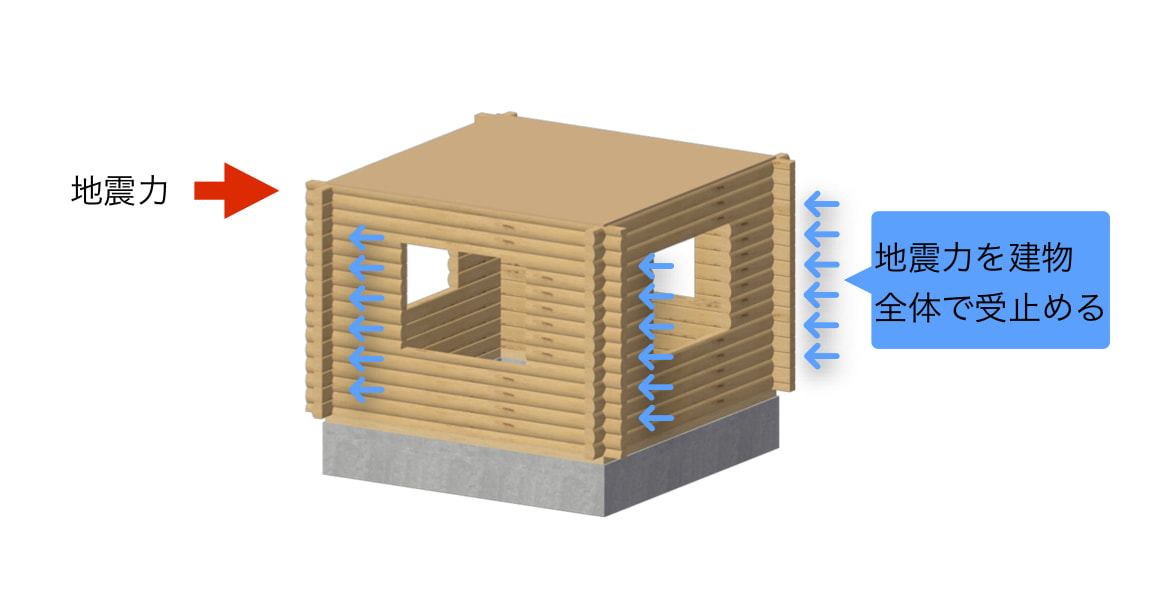 ログハウスは一般的な家に使う木材の3倍から5倍の量の木を使います。この圧倒的な量の木材を組み合わせ、さらに木ダボによって一体の壁構造にします。ログハウスもまた「面」で抵抗するから強いのです。