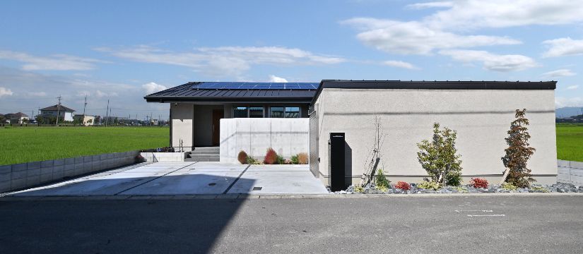 ふたつの大きな掃き出し窓から景色を楽しむ平屋の家