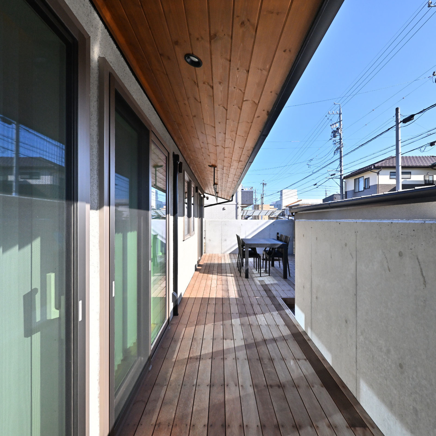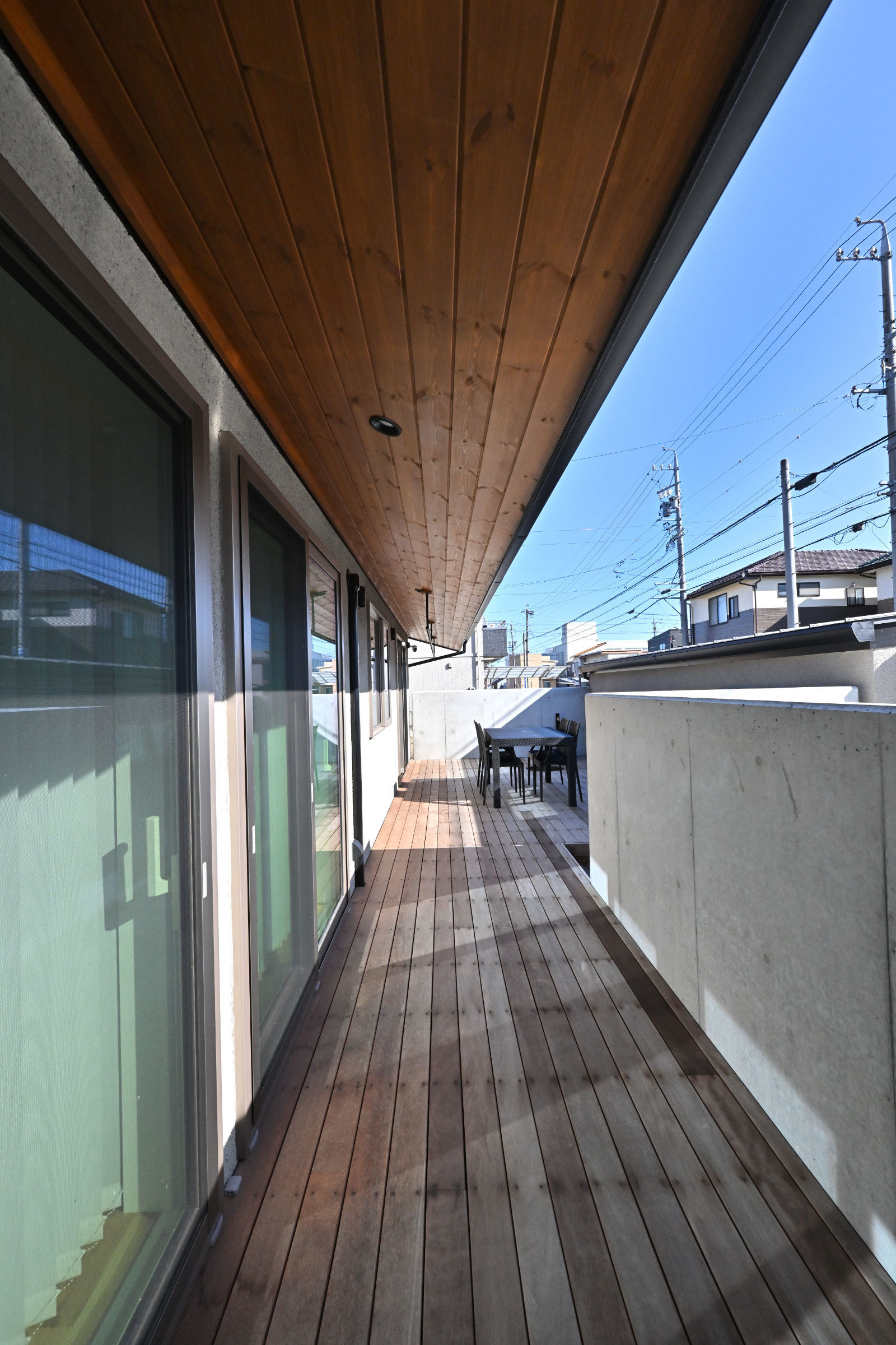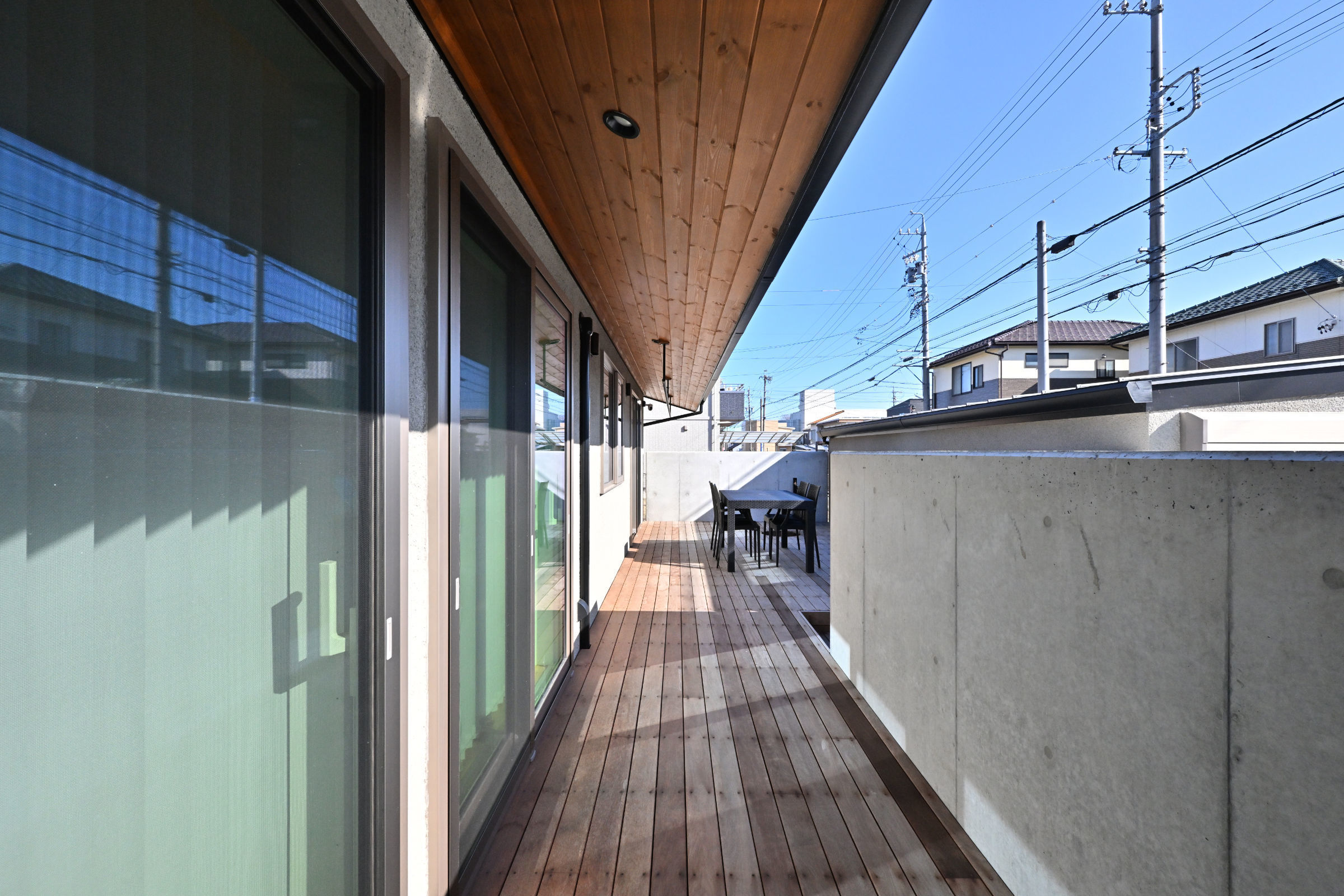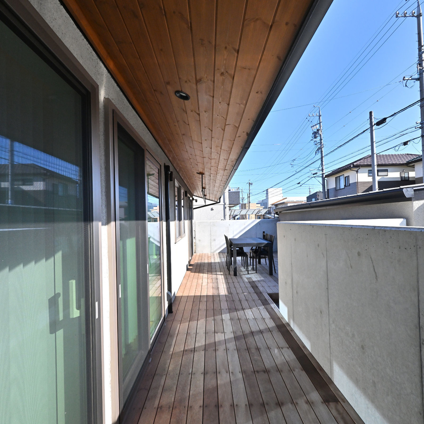 道路に面してリビングルームと2つの寝室が配置されていますが、それぞれのテラス戸からこの中庭のデッキテラスに直接出入りできるようになっています。通行人から内部が直接見えることはありません。お客様は、このデッキにテーブルと椅子を置いて、リビングや寝室の延長としてこのプライベートな外部空間を有効活用されています。