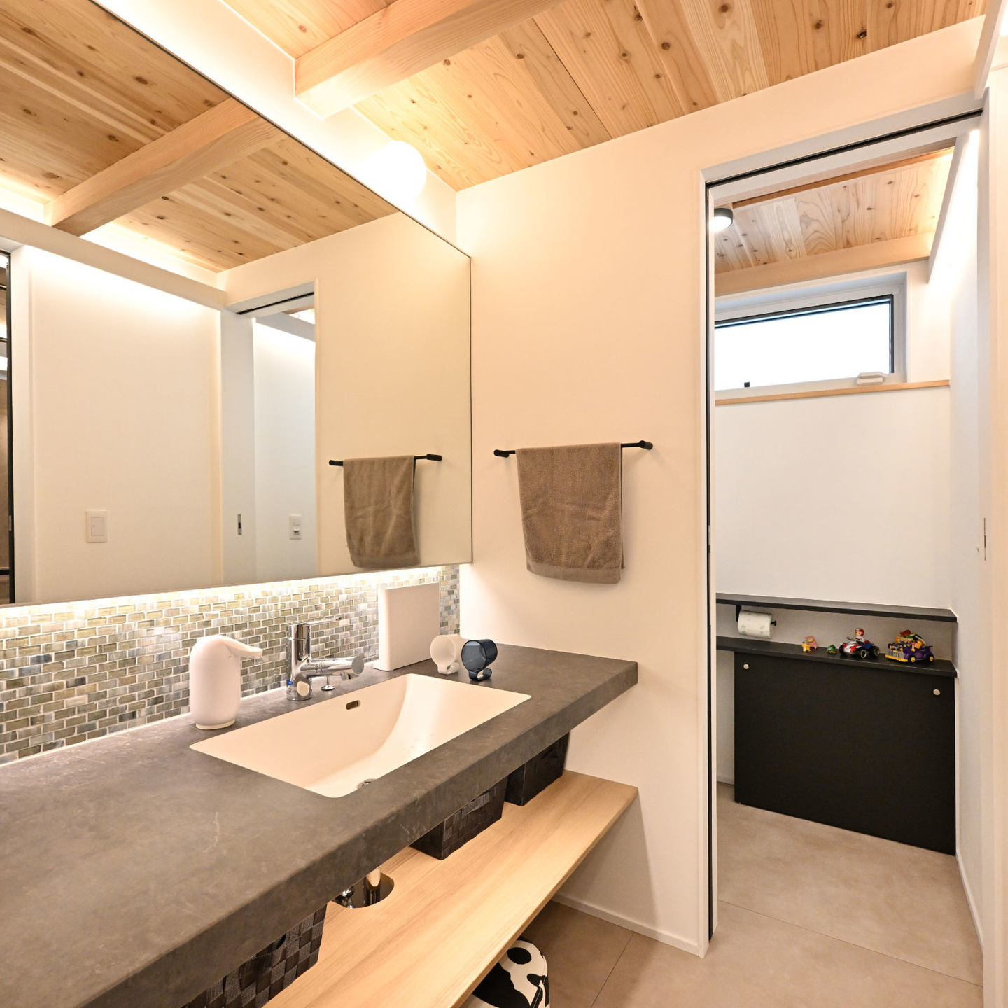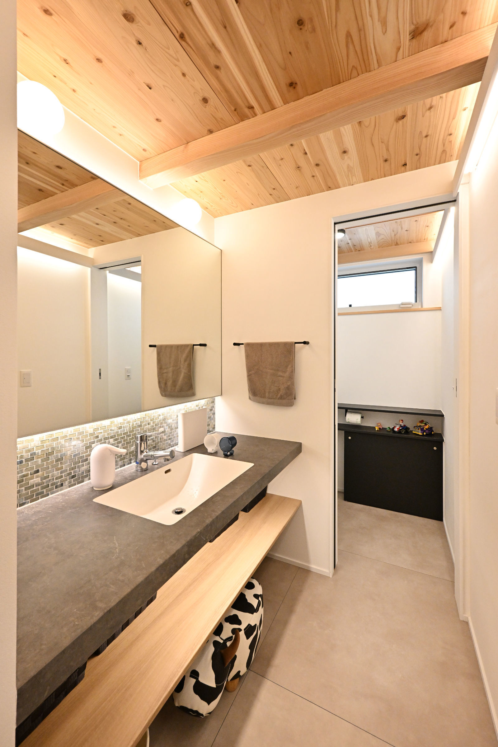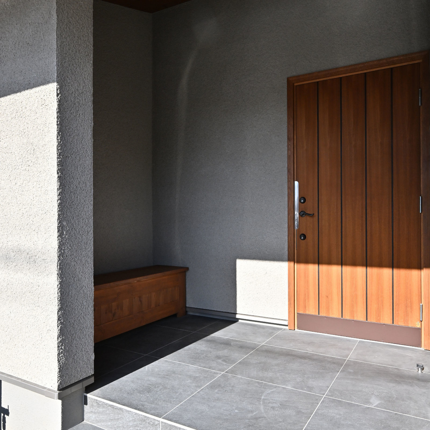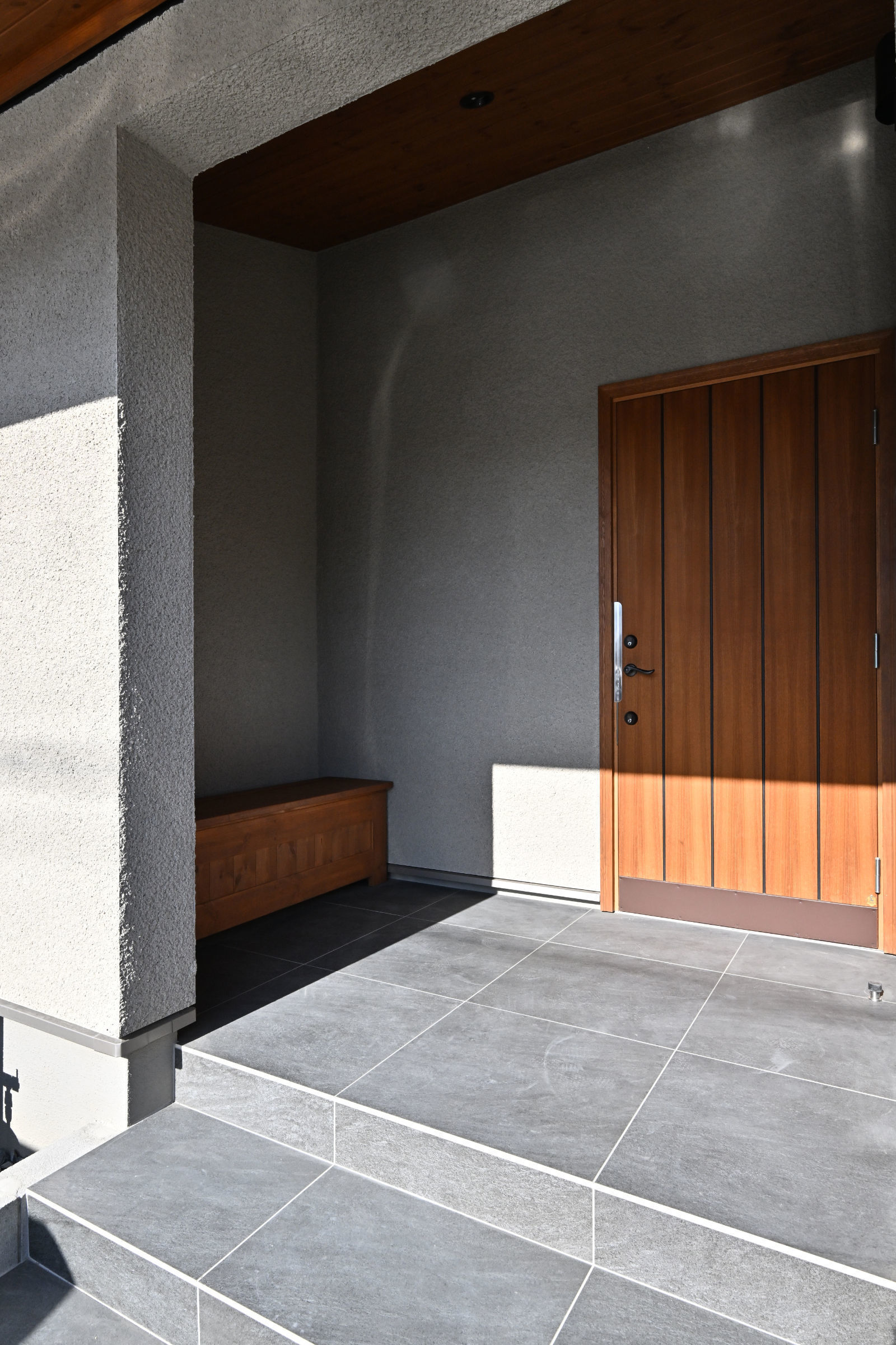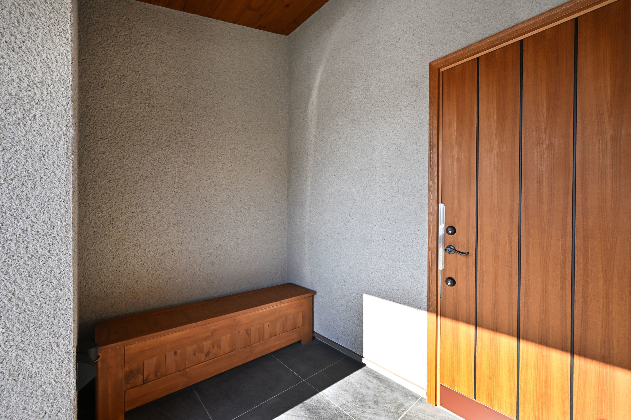 道路に面してリビングルームと2つの寝室が配置されていますが、それぞれのテラス戸からこの中庭のデッキテラスに直接出入りできるようになっています。通行人から内部が直接見えることはありません。お客様は、このデッキにテーブルと椅子を置いて、リビングや寝室の延長としてこのプライベートな外部空間を有効活用されています。