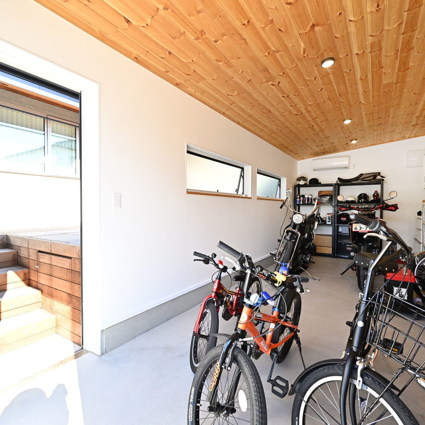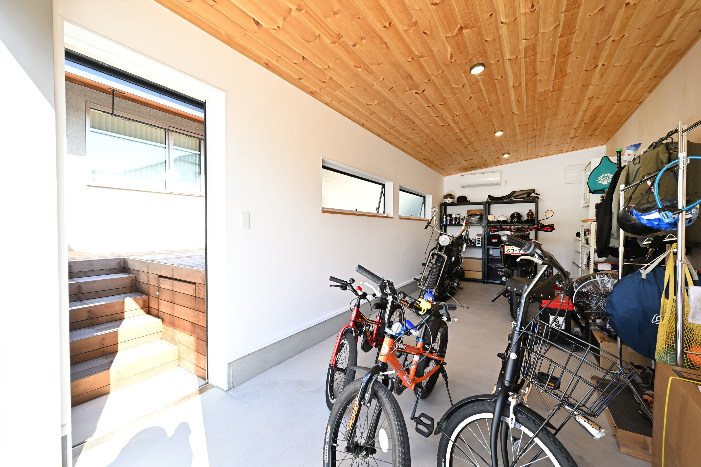 この家では、この課題を解決するため、道路と建物の間に緩衝空間を設けています。具体的には、バイクガレージとコンクリート打ち放しの塀を配置し、その内側に小さなデッキテラス(中庭)を造ることで、窓が道路から直接見えないように工夫しました。