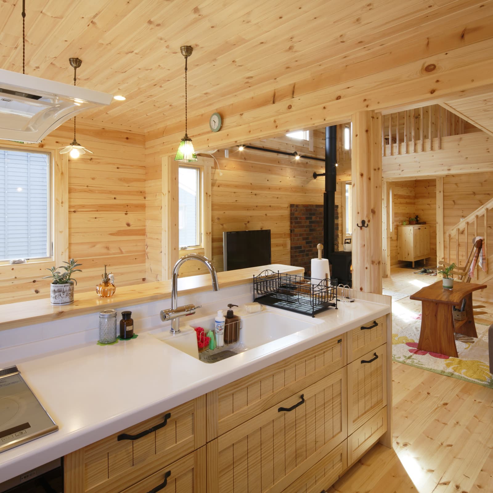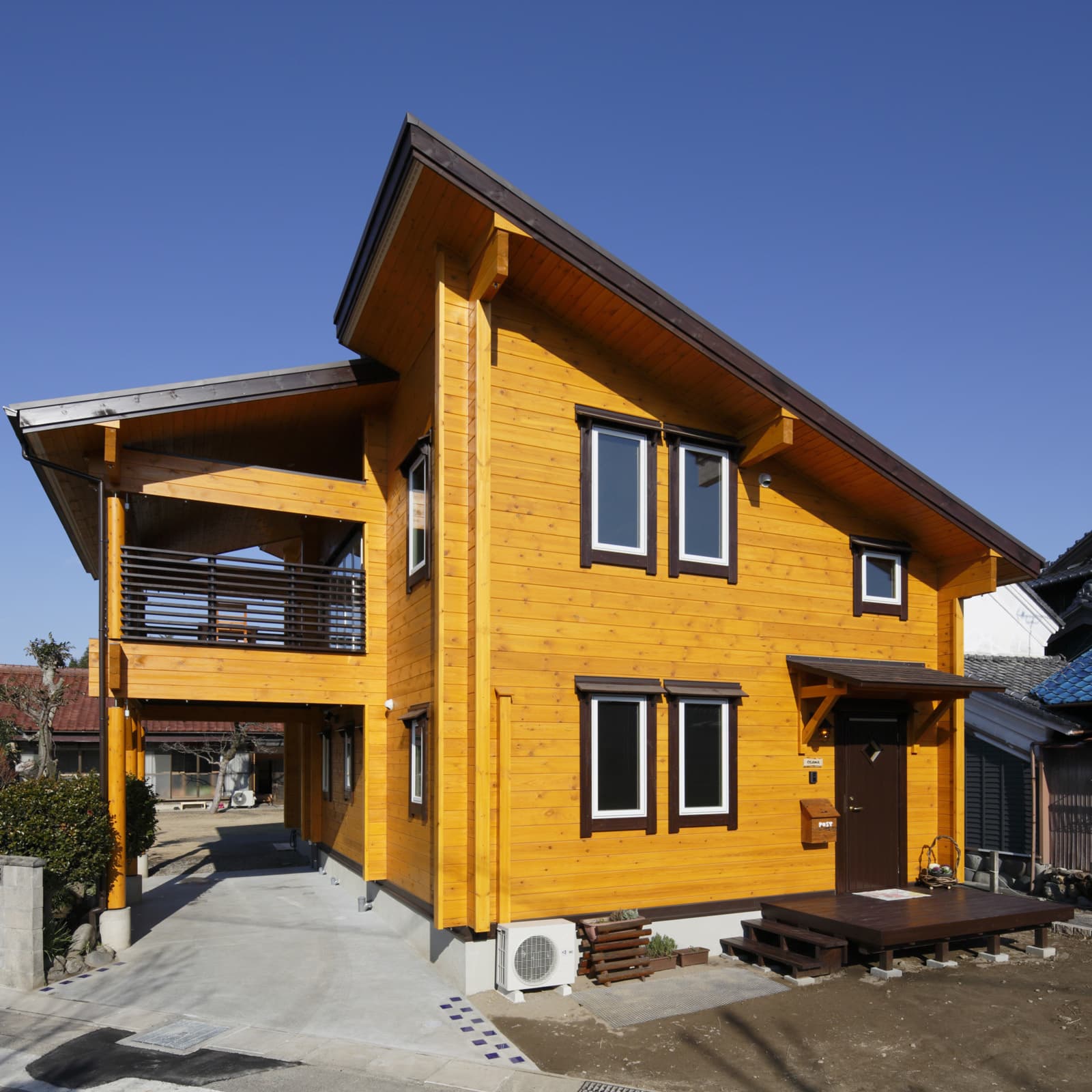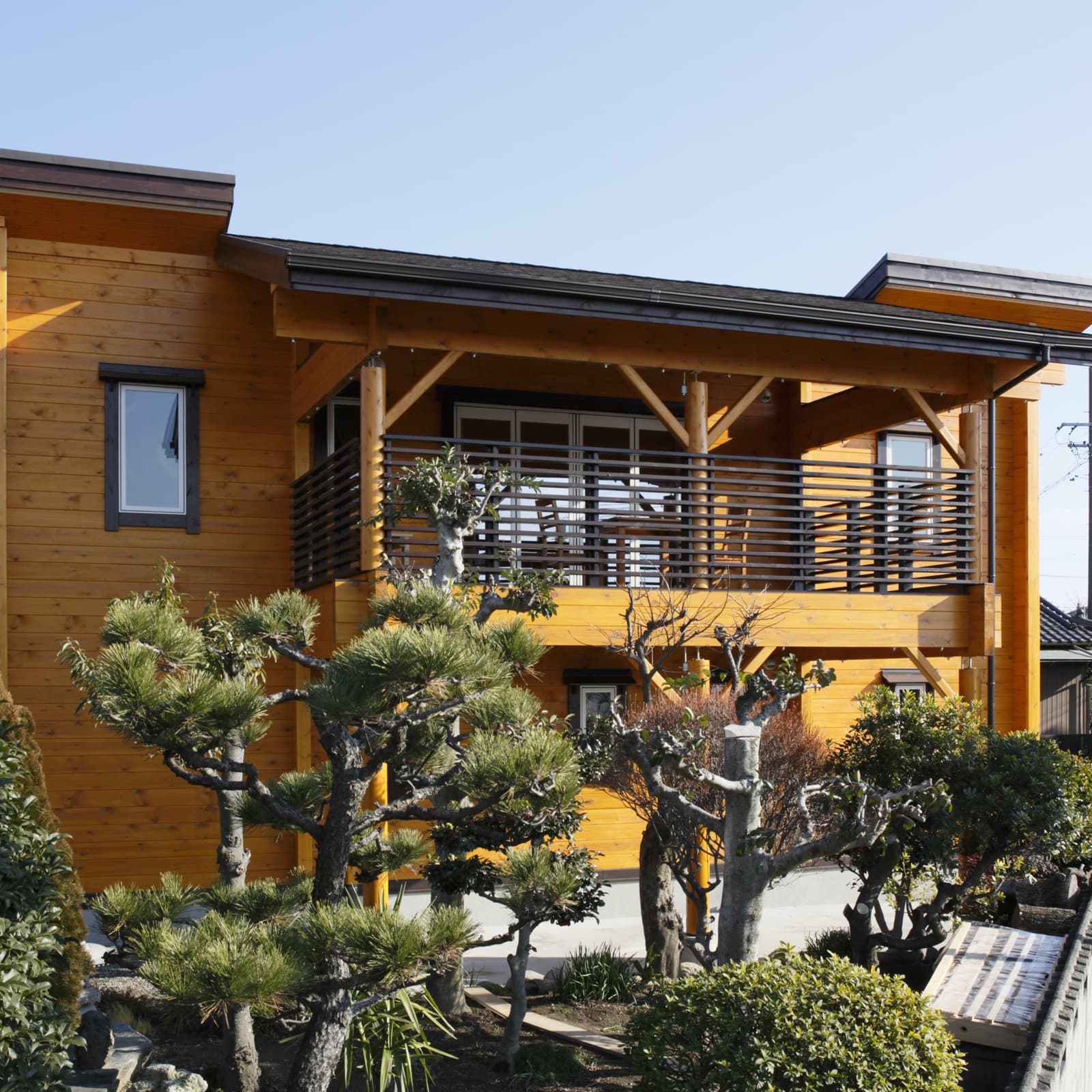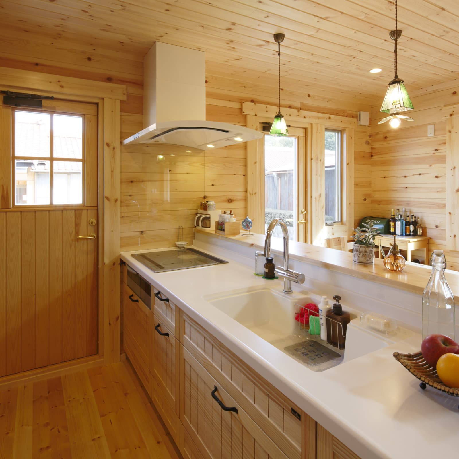 この家は、シックハウスを心配される施主様の要望に応え、合板ゼロ仕様としました。見えない下地も構造用合板ではなく無垢の杉板の斜め張りで対応しています。玄関や勝手口の庇からエアコンカバーまで木にこだわって仕上げたログハウスです。