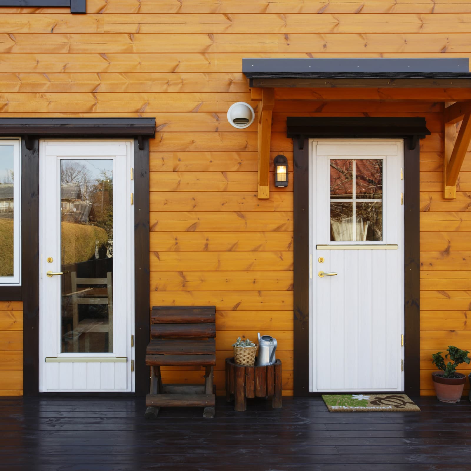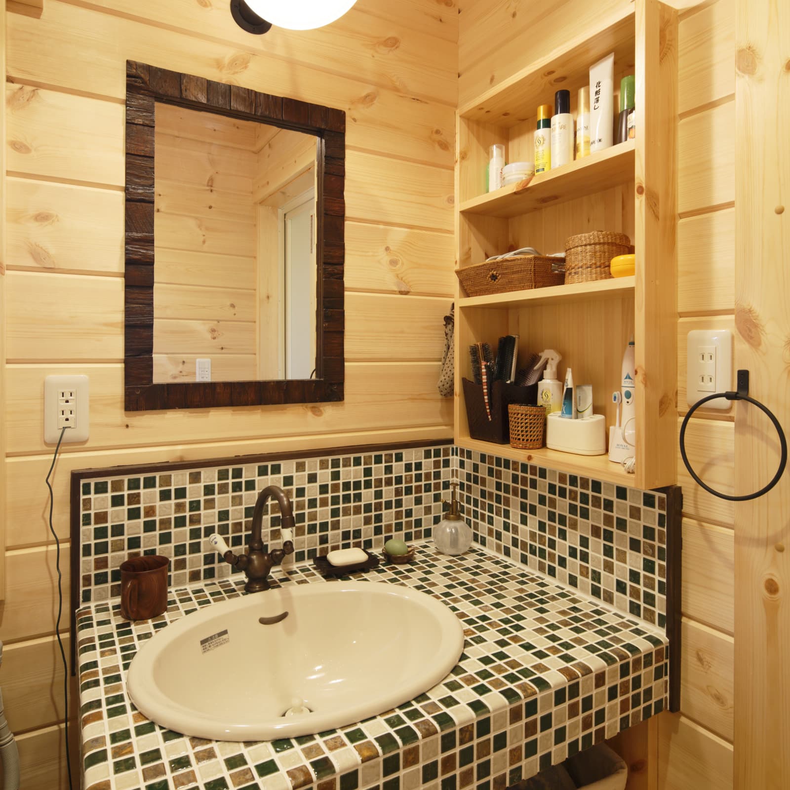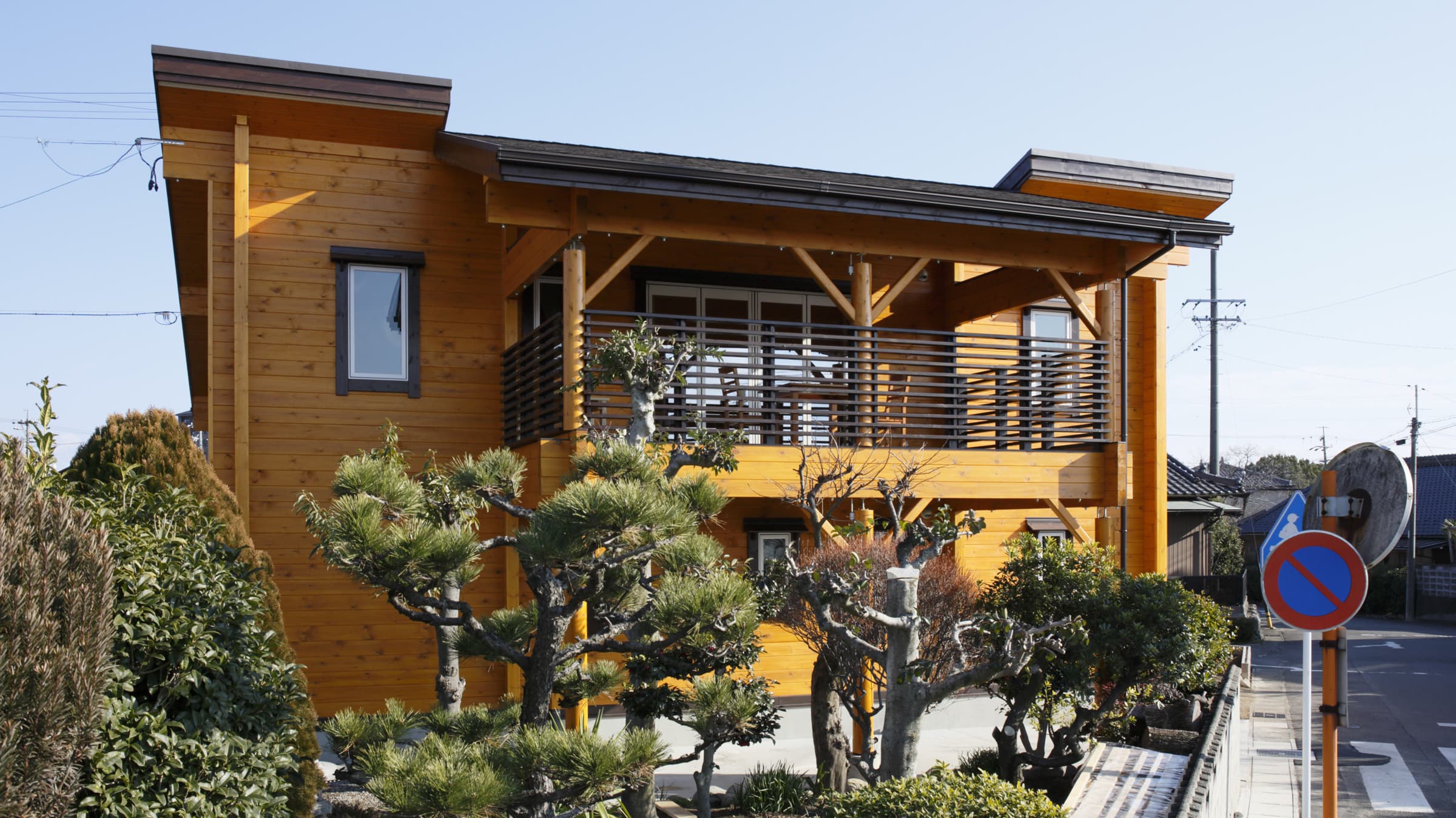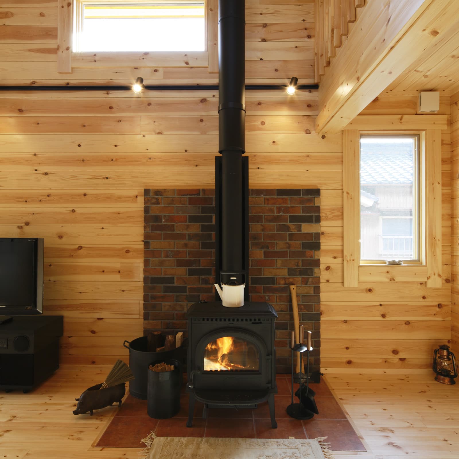 この家は、シックハウスを心配される施主様の要望に応え、合板ゼロ仕様としました。見えない下地も構造用合板ではなく無垢の杉板の斜め張りで対応しています。玄関や勝手口の庇からエアコンカバーまで木にこだわって仕上げたログハウスです。