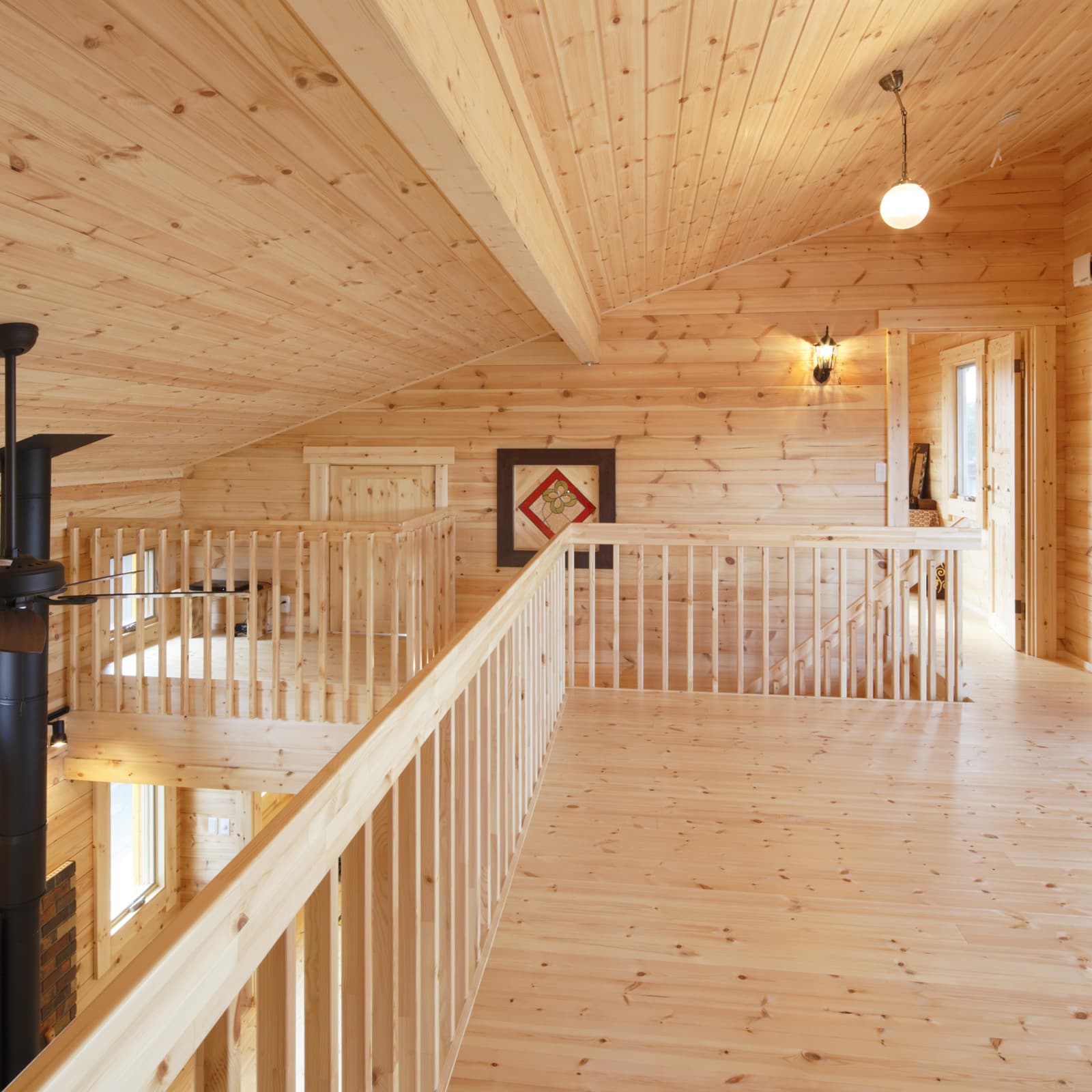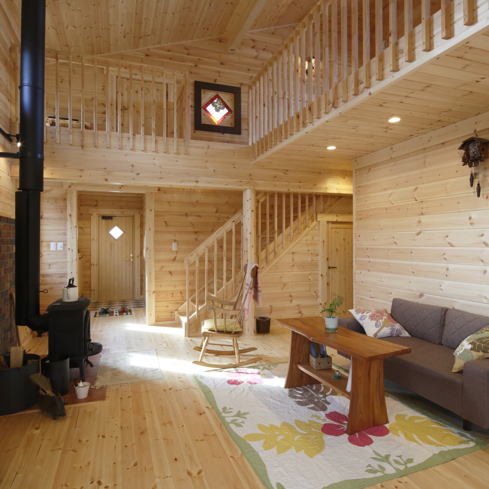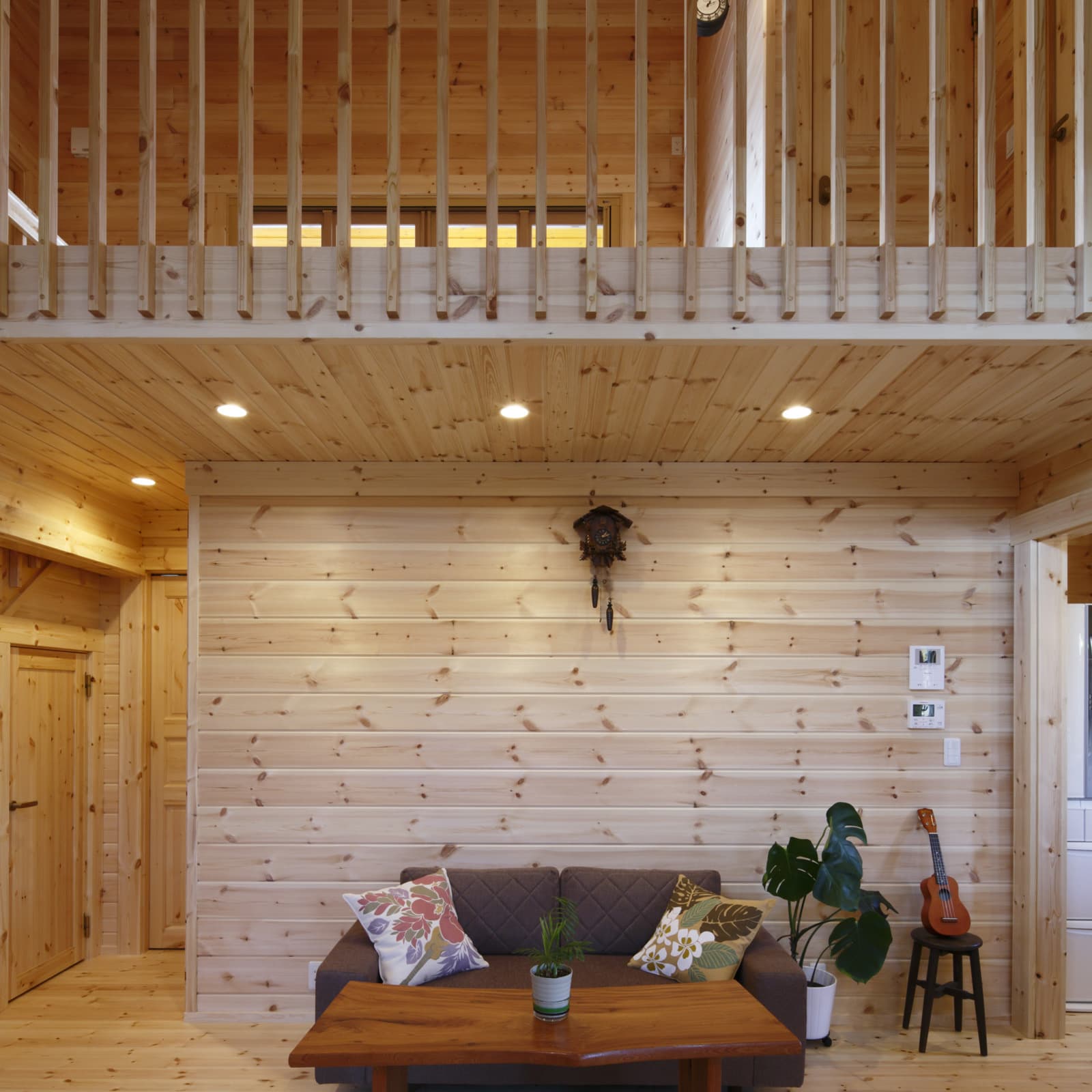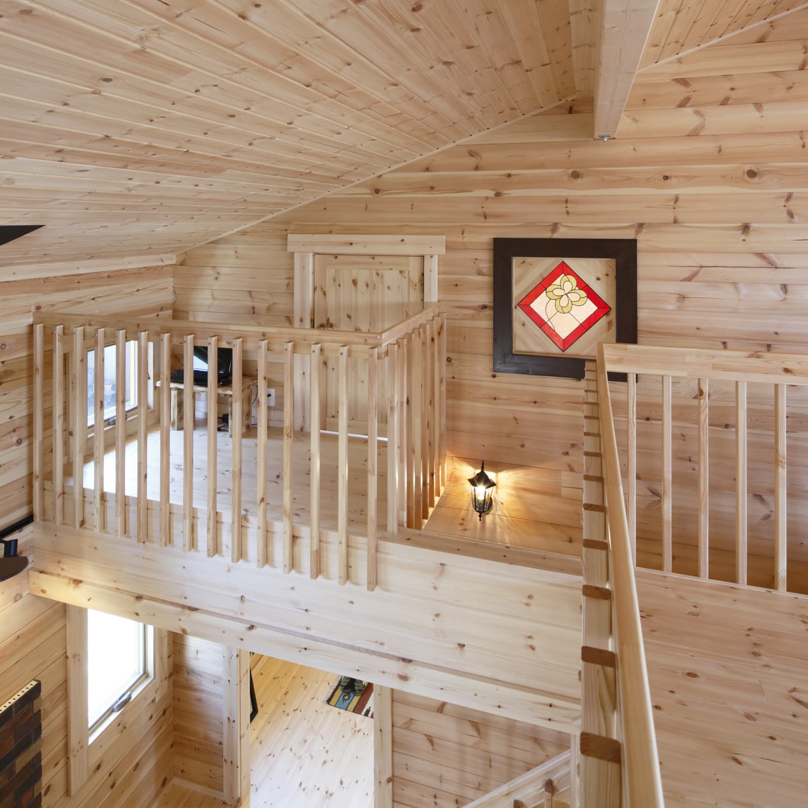 ご両親が住む敷地内に建てられたログハウスです。1階のリビングから吹き抜けのファミリースペース、そして広々としたバルコニーへと続くオープンな空間構成は、家族や友人が集まれる開放感ある場所になっています。バルコニーからは中庭を通して母屋を眺めることができます。