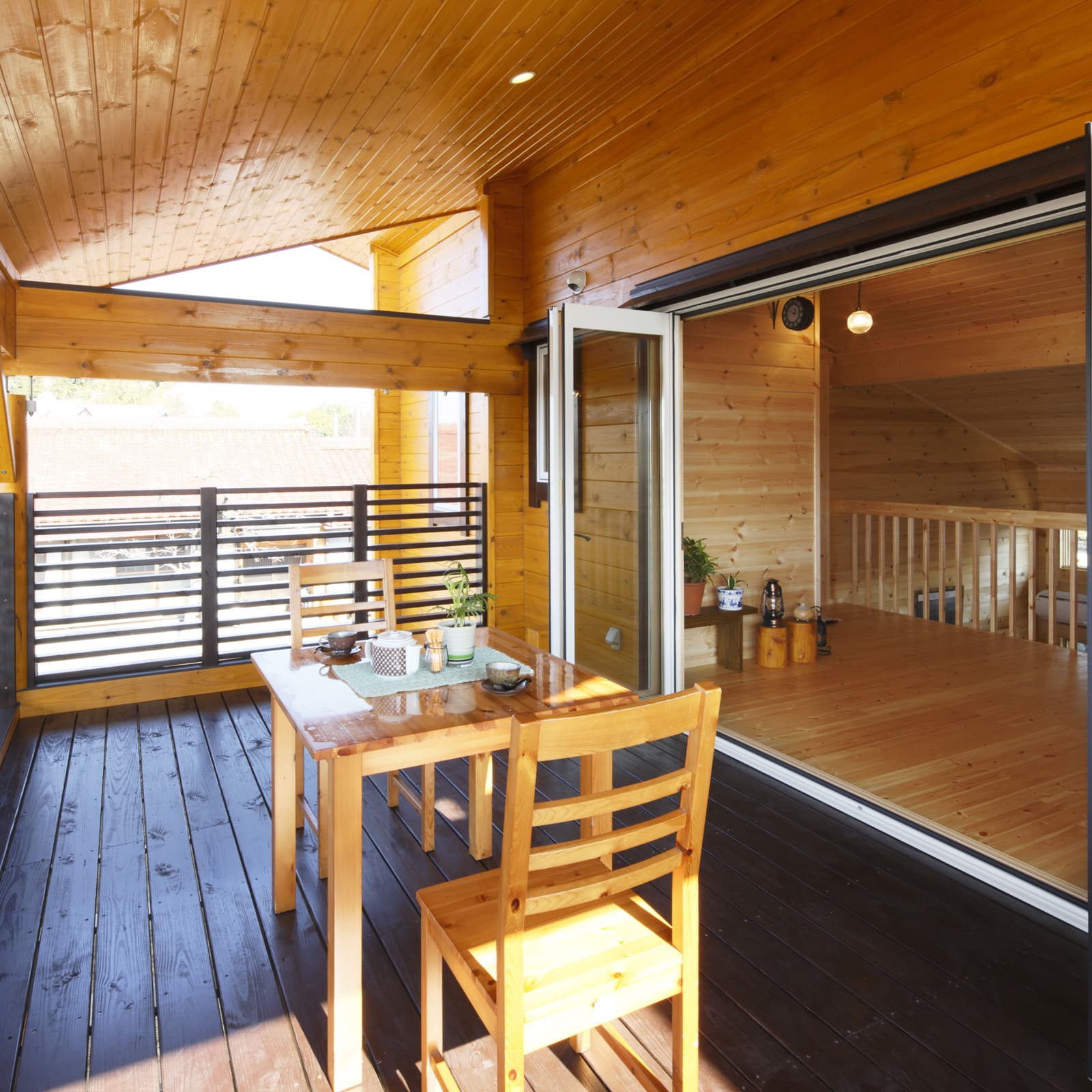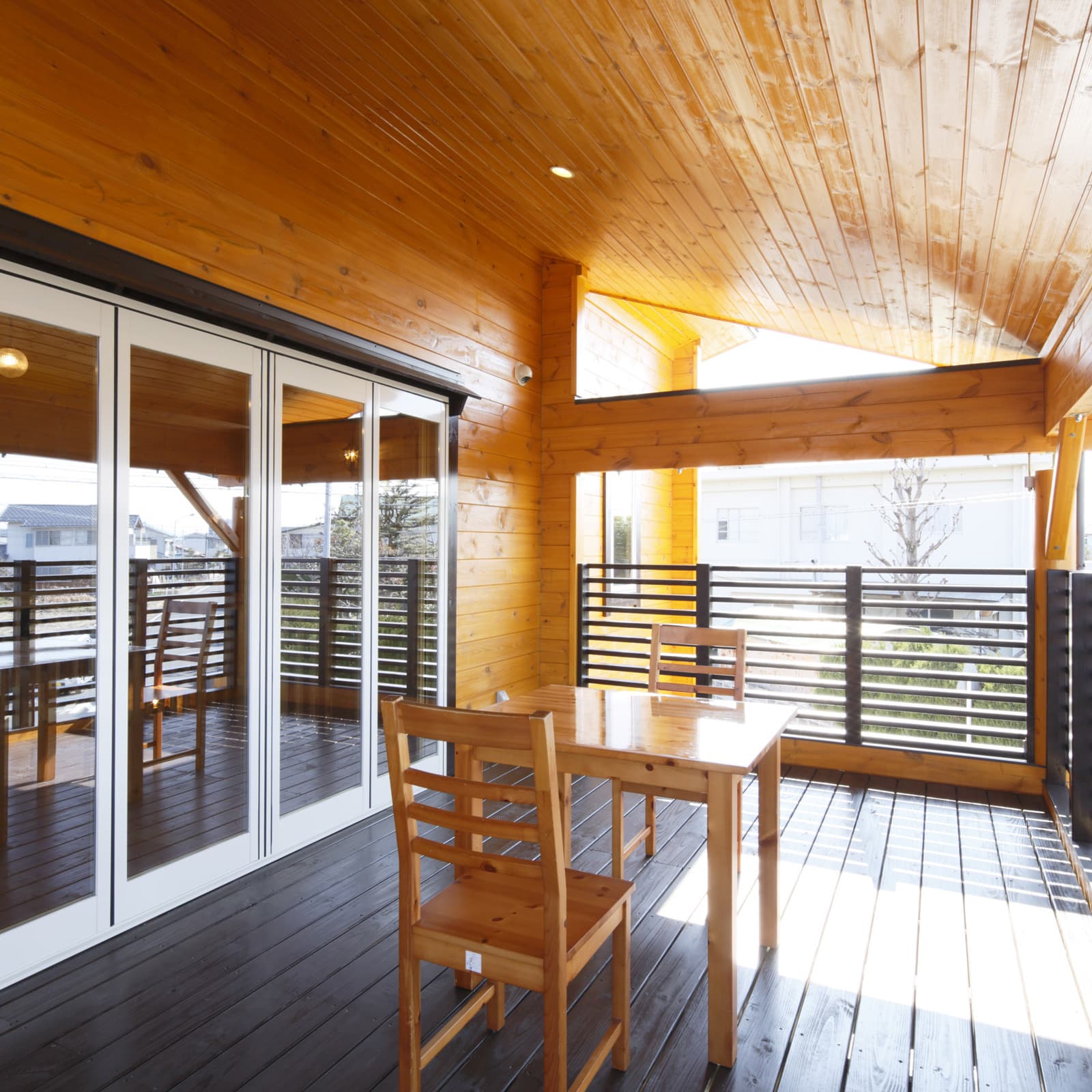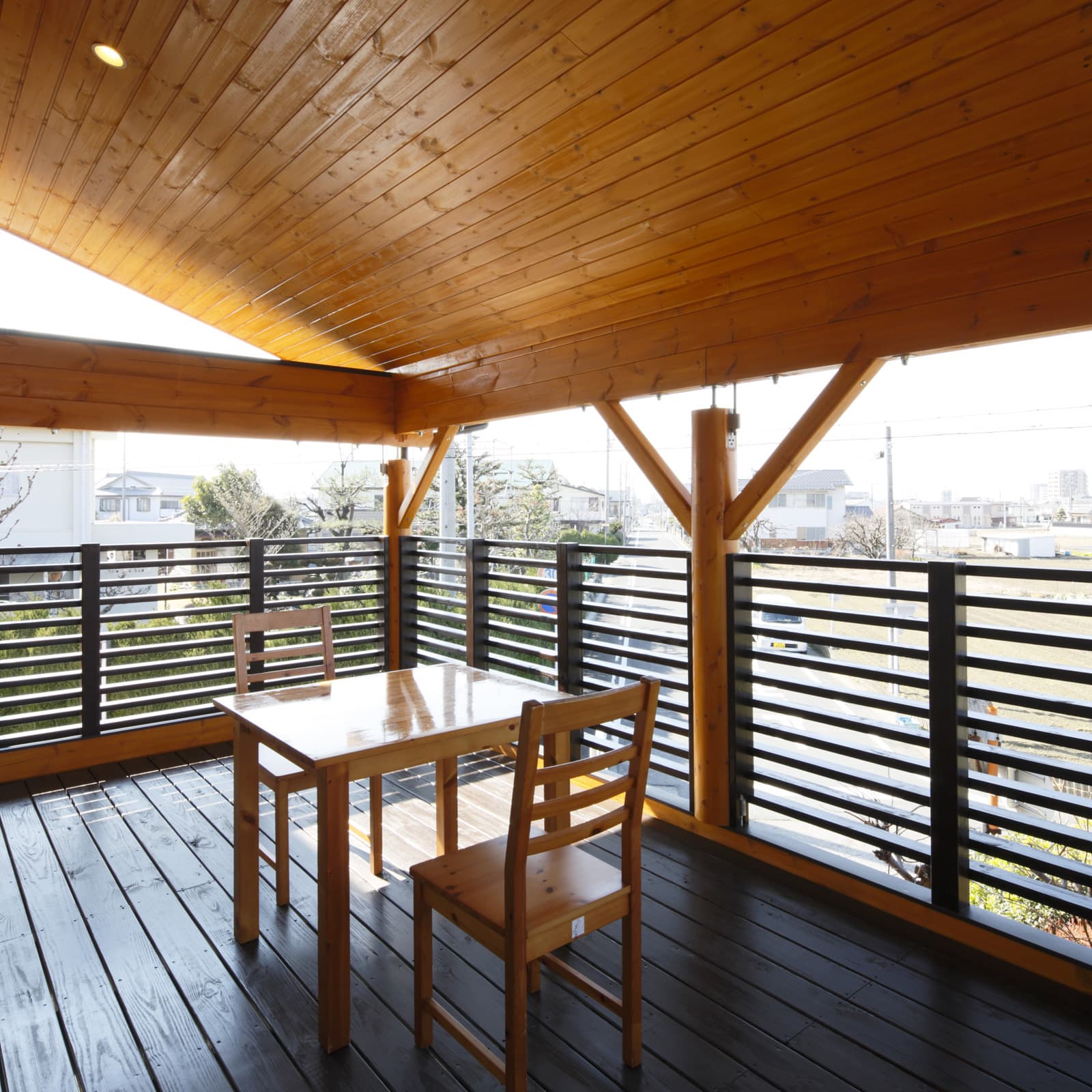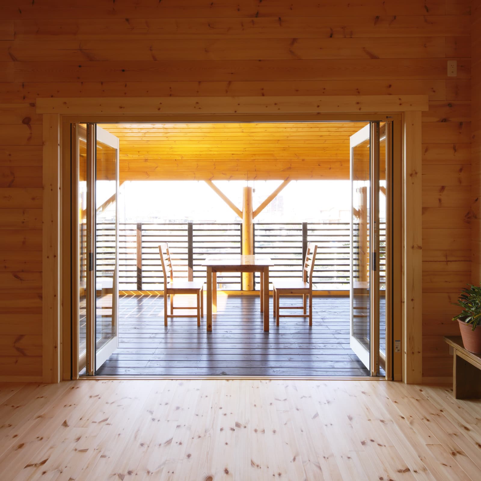 ご両親が住む敷地内に建てられたログハウスです。1階のリビングから吹き抜けのファミリースペース、そして広々としたバルコニーへと続くオープンな空間構成は、家族や友人が集まれる開放感ある場所になっています。バルコニーからは中庭を通して母屋を眺めることができます。