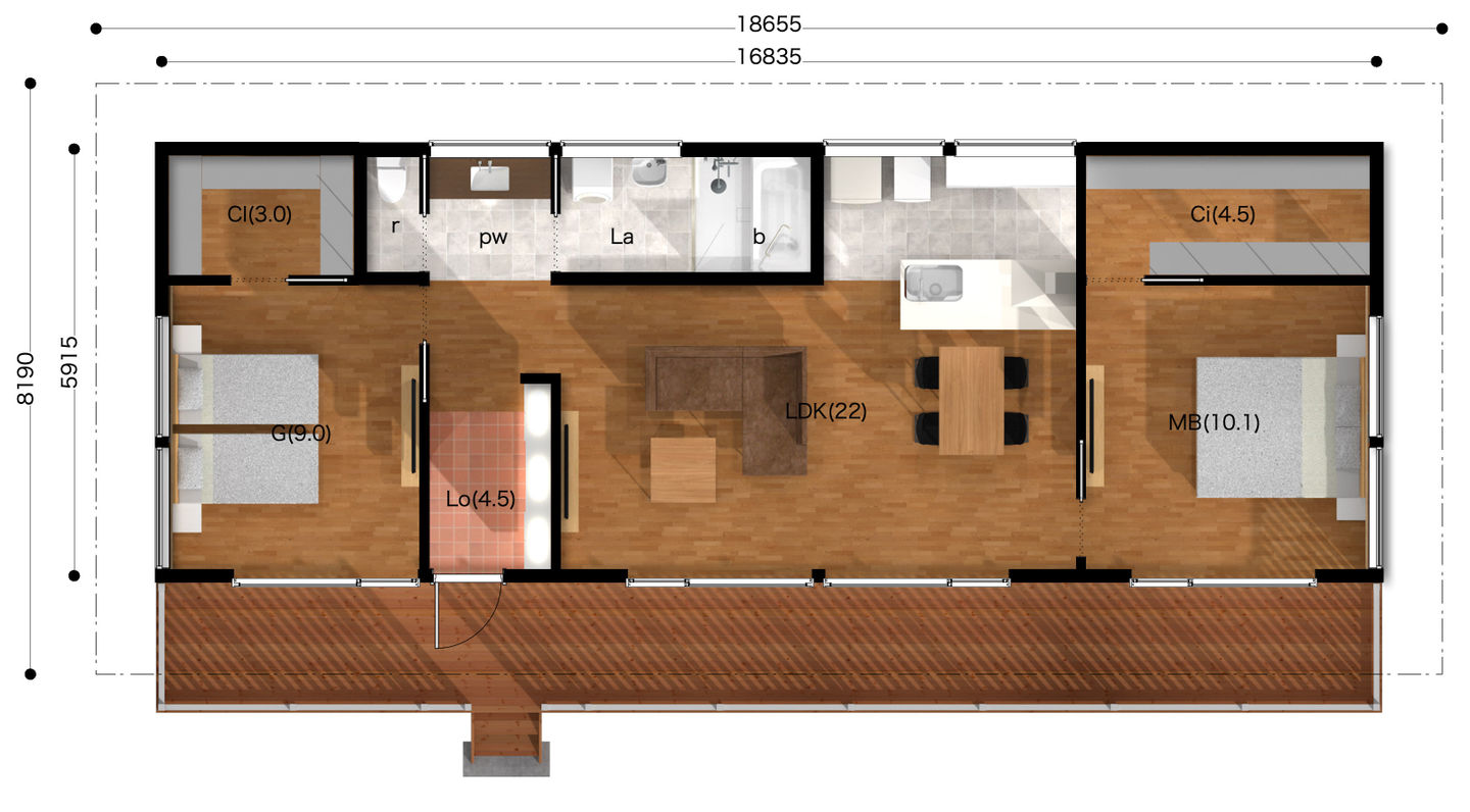 南玄関の平屋建てプランです。建物の南側には全面デッキテラスを設け、森の中で木に囲まれて暮らすイメージで設計しました。高断熱構造にトリプルガラス窓を採用した建物に全館空調と全室床暖房を装備して、快適に暮らしていただける仕様です。