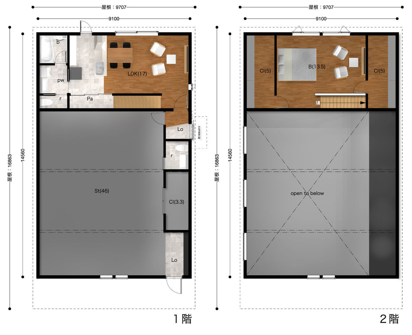 広さ46帖、高さ3.5メートル以上ある店舗を持つ兼用住宅プランです