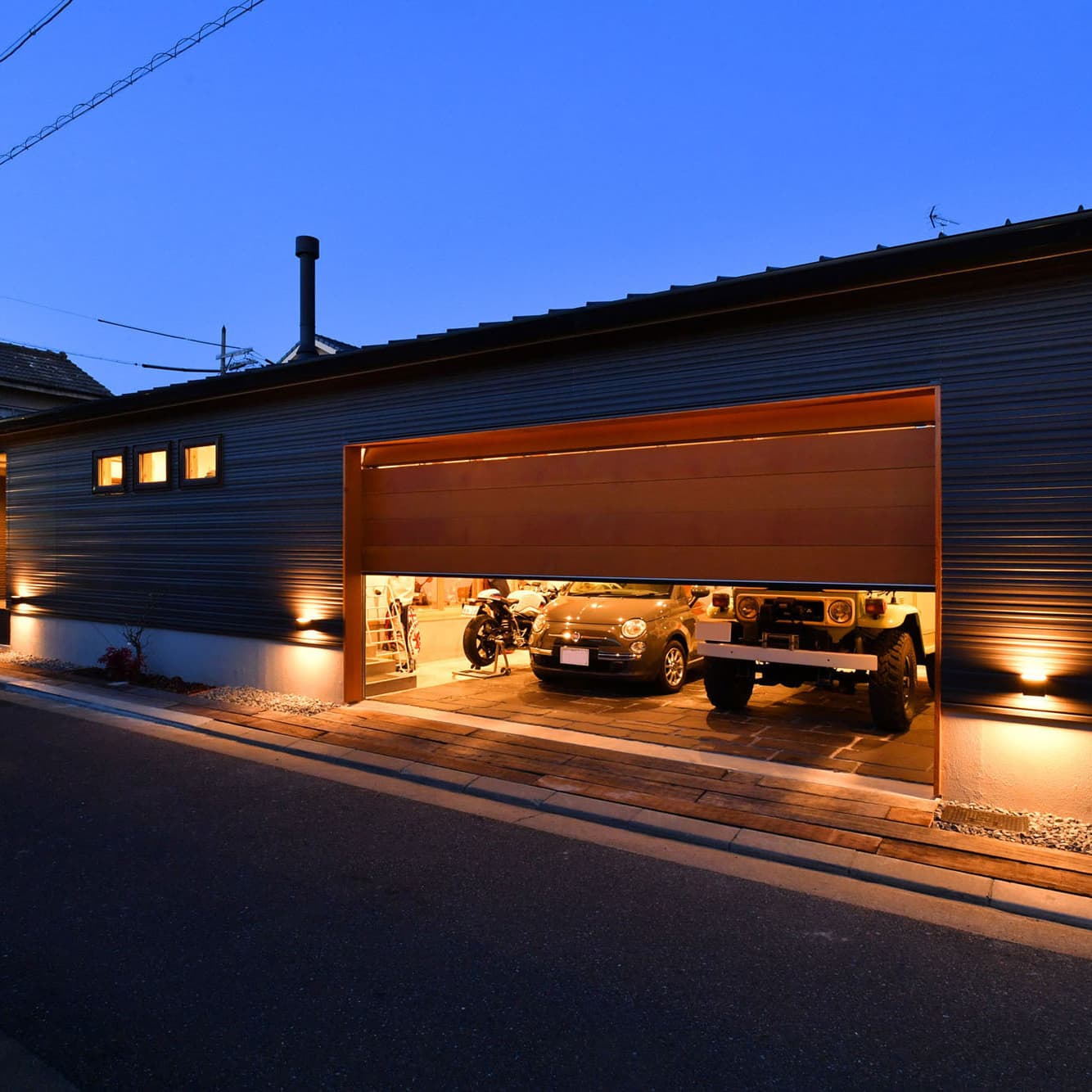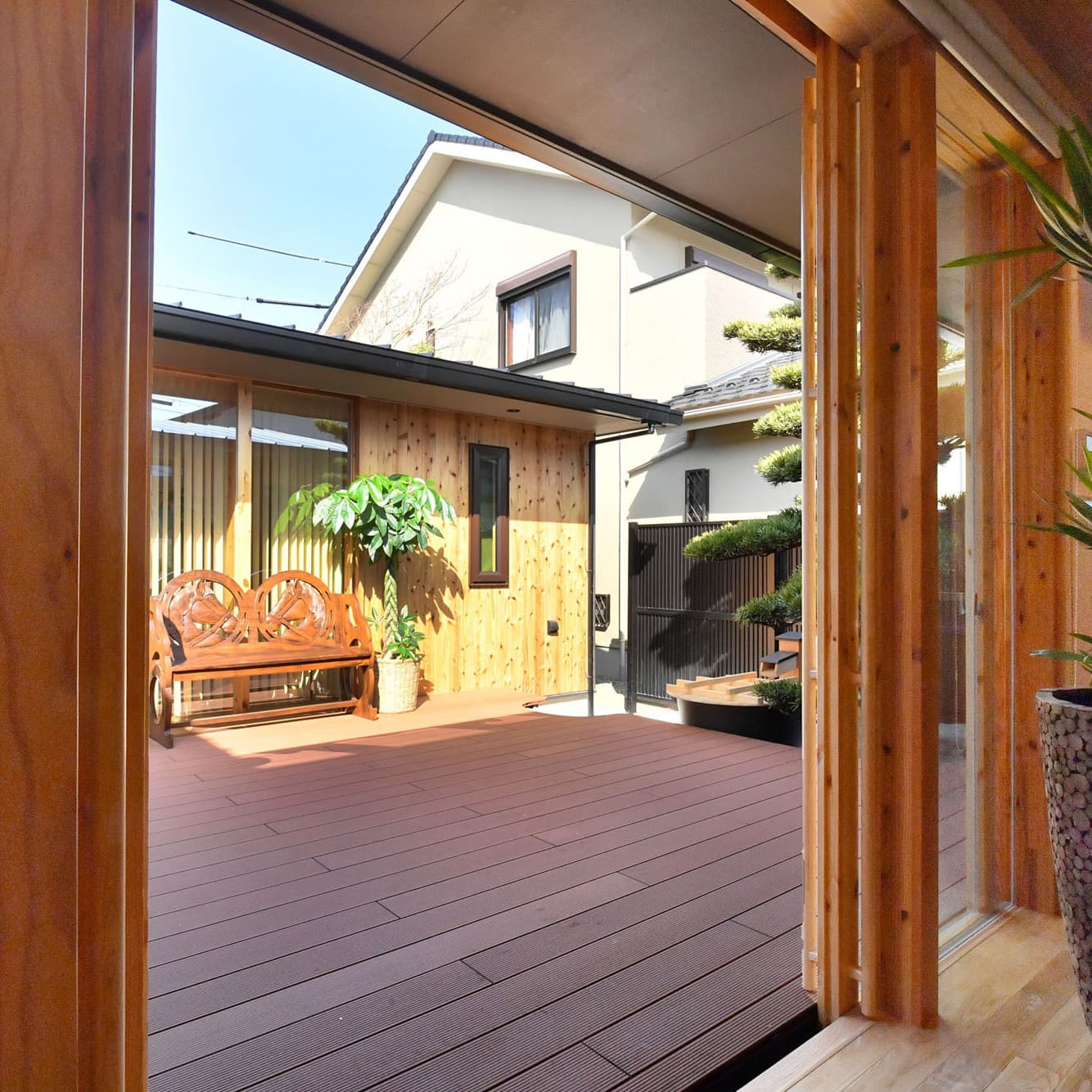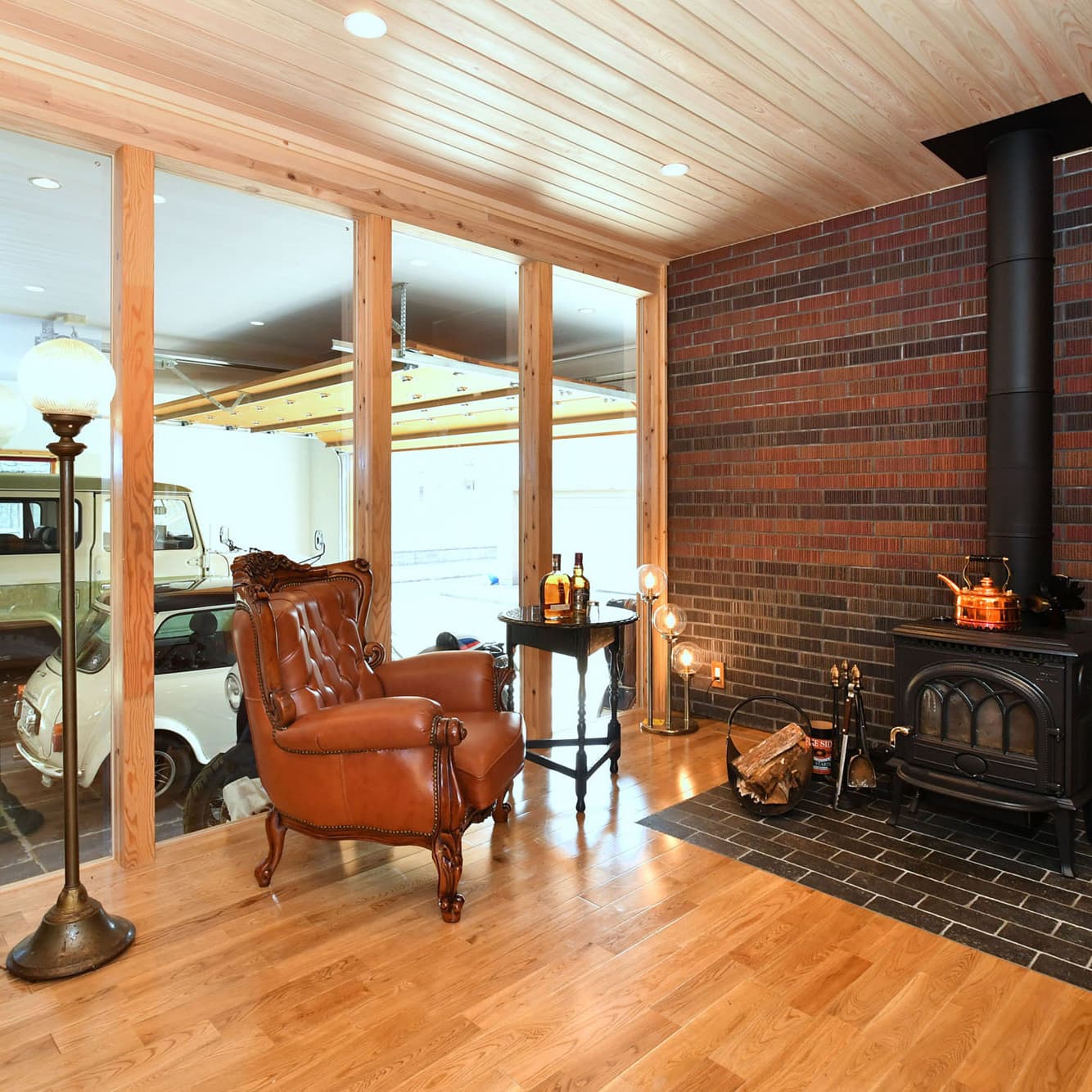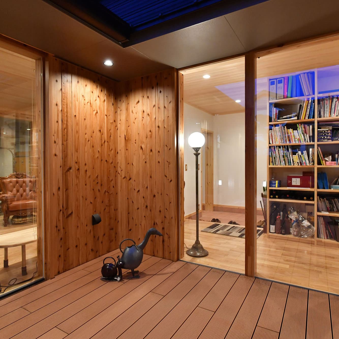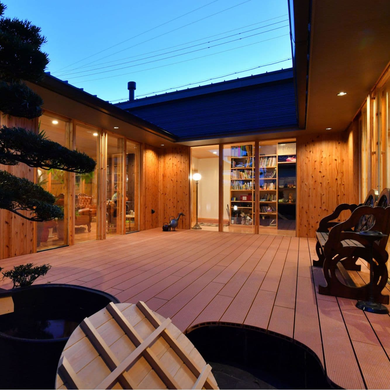 旧車とよばれるクルマを弄るのが趣味の施主様からガレージ付きの平屋の計画依頼を受けました。場所は住宅が密集する準防火地域です。この敷地にウッディな雰囲気の中庭とリビングから眺められるガレージがある設計を提案しました。柱の間に真空断熱ガラスをはめ込んだテラス窓は下枠を床に隠すように工夫してあり、フローリング床が屋外のデッキに繋がるように見せてあります。施主様の遊び心で中庭にはひとり用の露天風呂が作られてます。