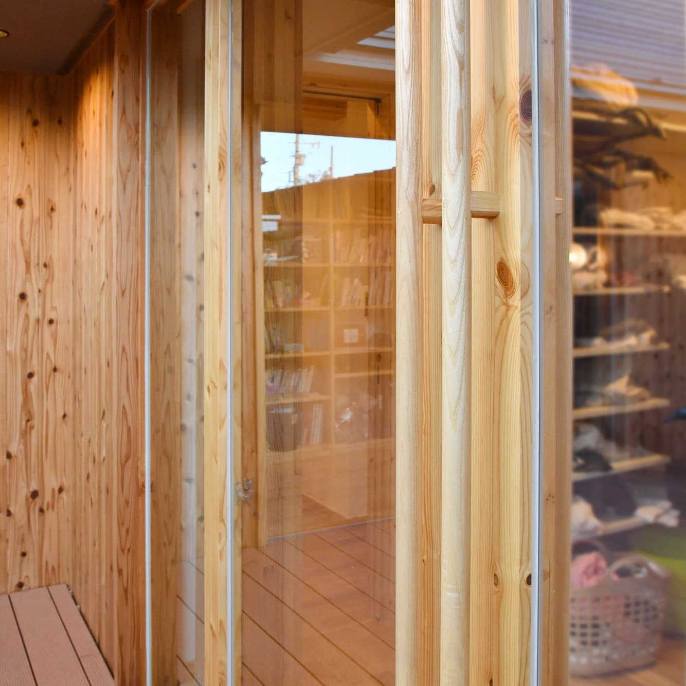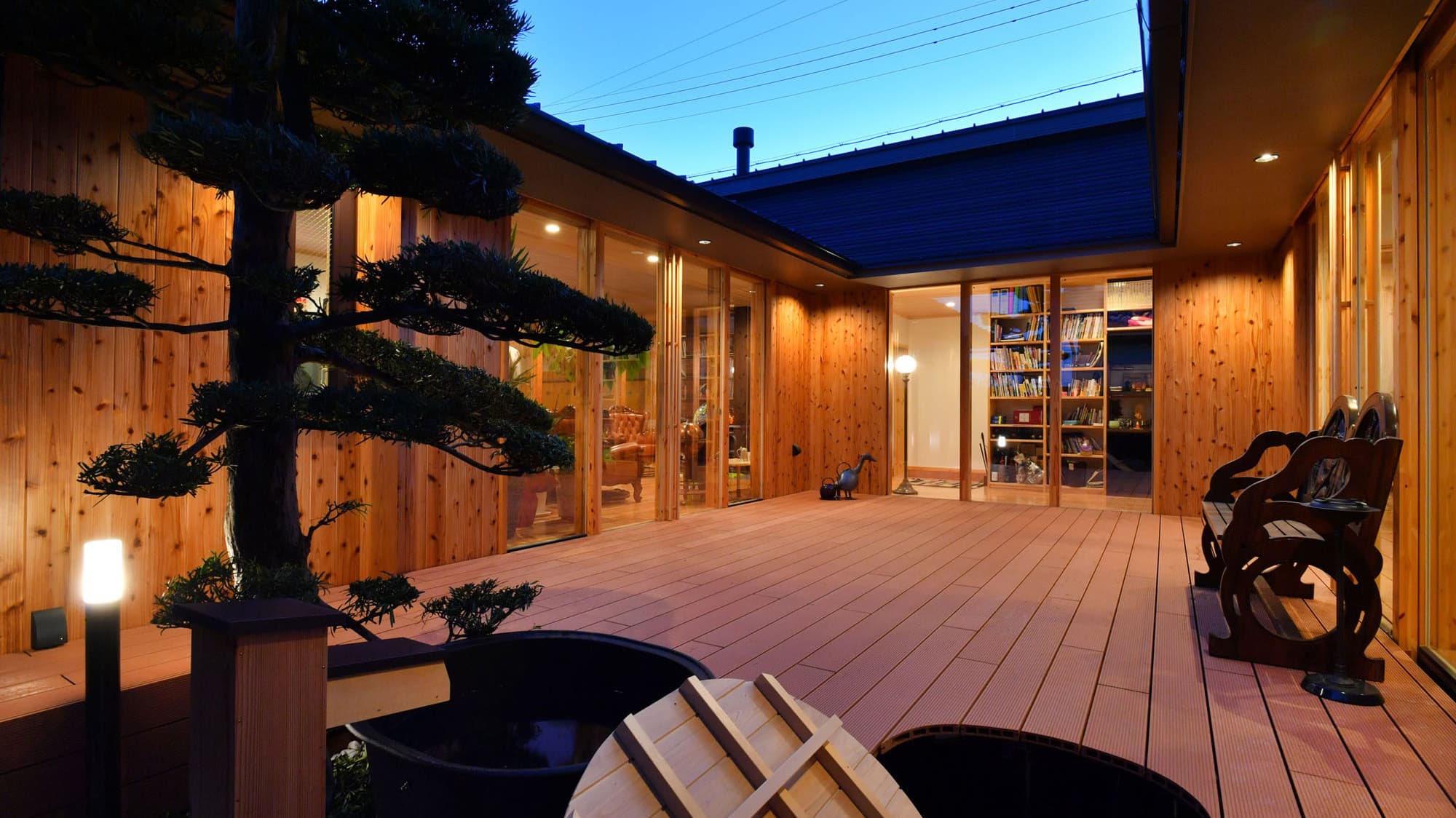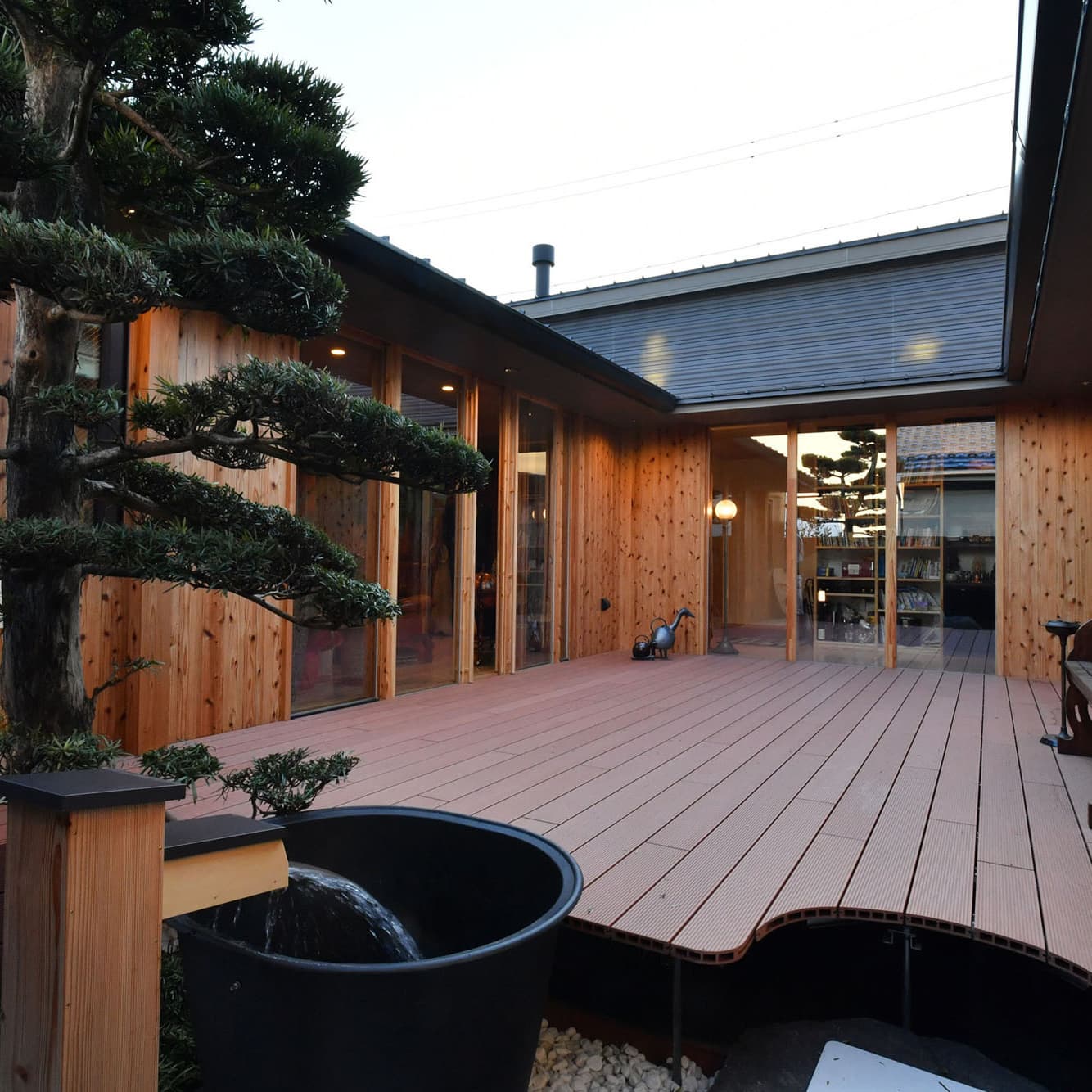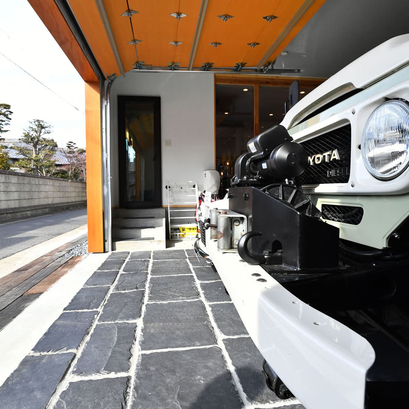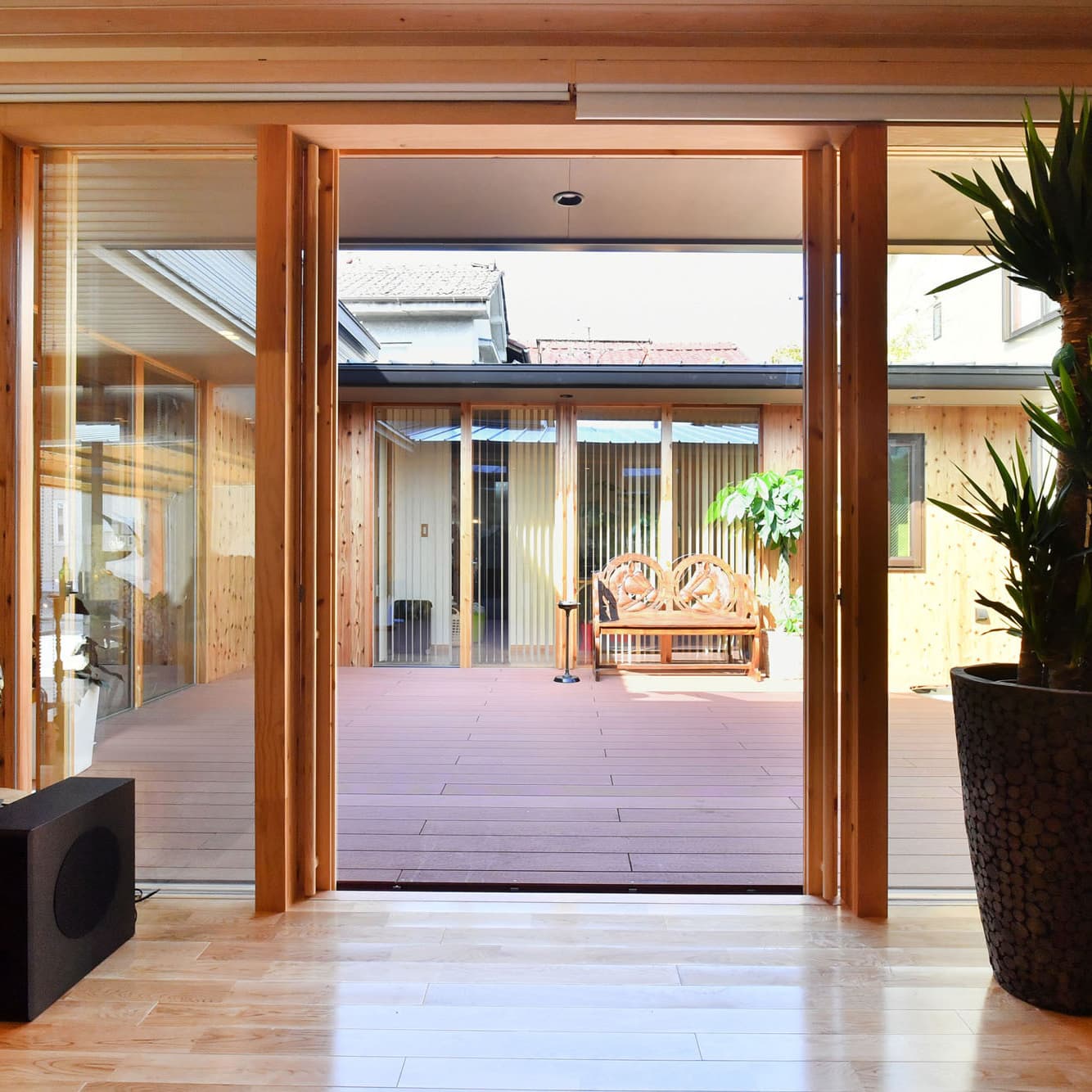 旧車とよばれるクルマを弄るのが趣味の施主様からガレージ付きの平屋の計画依頼を受けました。場所は住宅が密集する準防火地域です。この敷地にウッディな雰囲気の中庭とリビングから眺められるガレージがある設計を提案しました。柱の間に真空断熱ガラスをはめ込んだテラス窓は下枠を床に隠すように工夫してあり、フローリング床が屋外のデッキに繋がるように見せてあります。施主様の遊び心で中庭にはひとり用の露天風呂が作られてます。