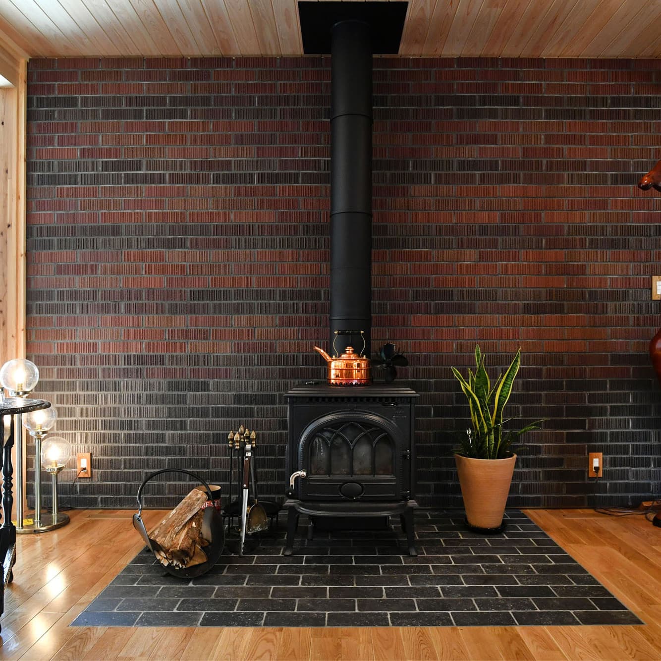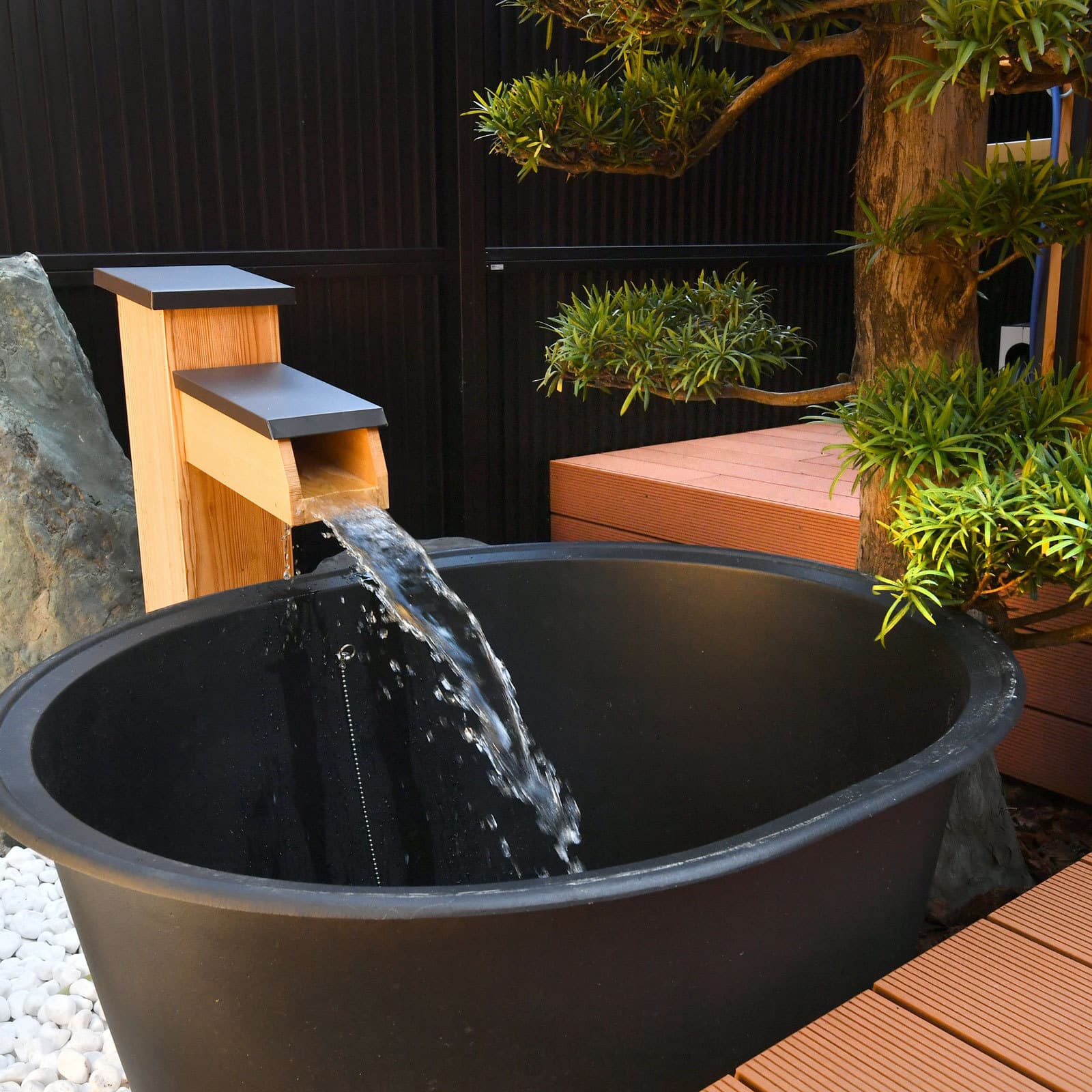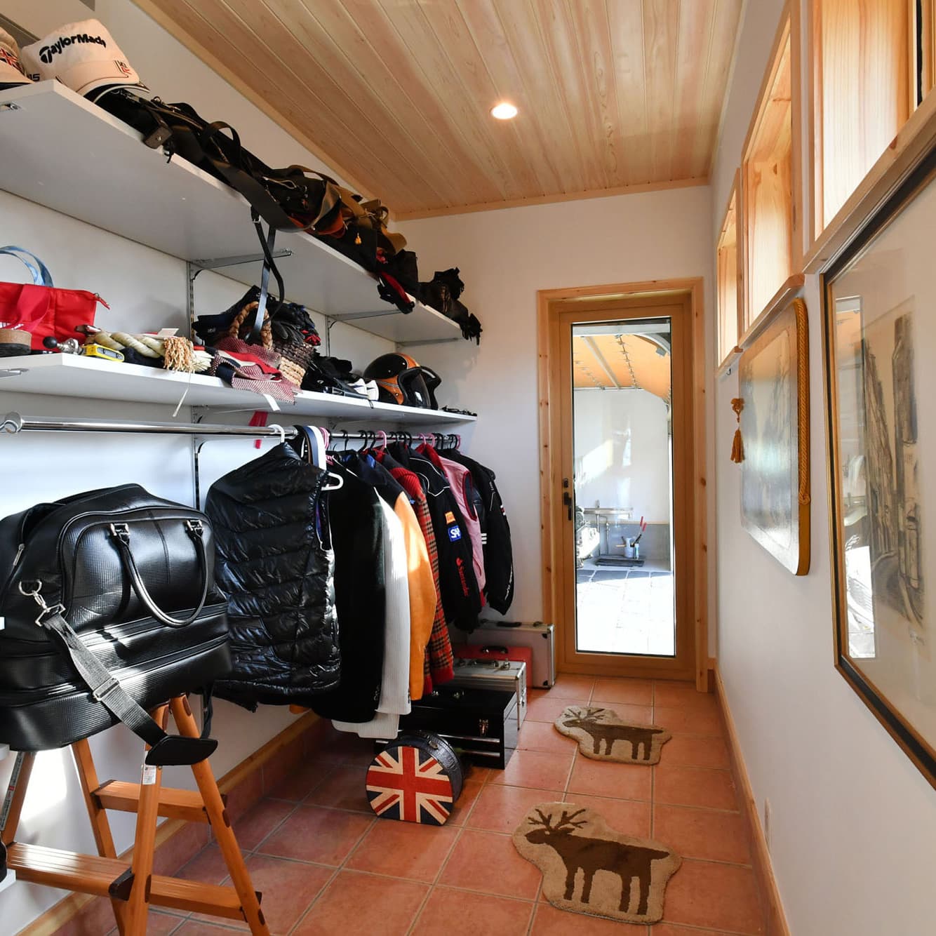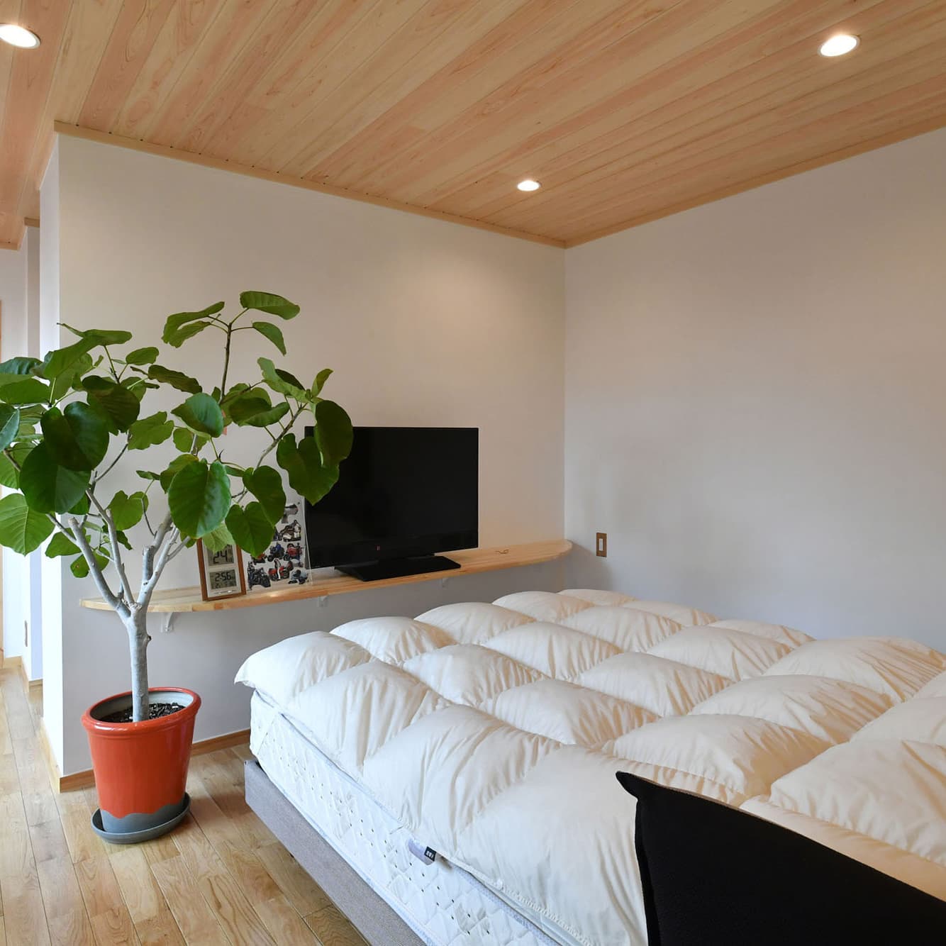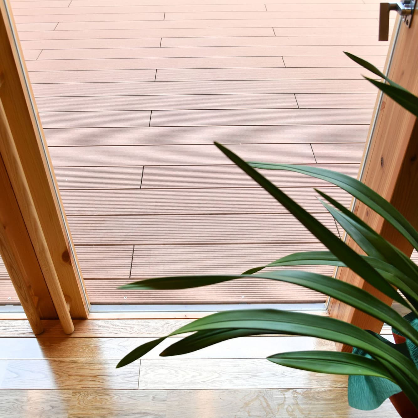旧車とよばれるクルマを弄るのが趣味の施主様からガレージ付きの平屋の計画依頼を受けました。場所は住宅が密集する準防火地域です。この敷地にウッディな雰囲気の中庭とリビングから眺められるガレージがある設計を提案しました。柱の間に真空断熱ガラスをはめ込んだテラス窓は下枠を床に隠すように工夫してあり、フローリング床が屋外のデッキに繋がるように見せてあります。施主様の遊び心で中庭にはひとり用の露天風呂が作られてます。