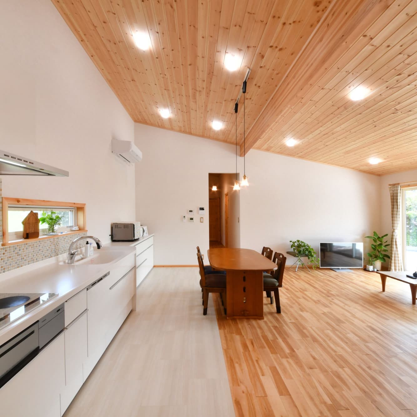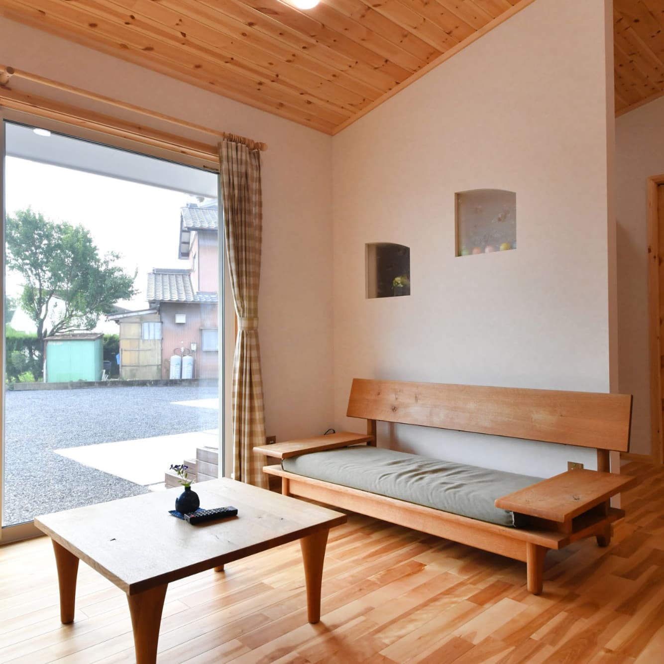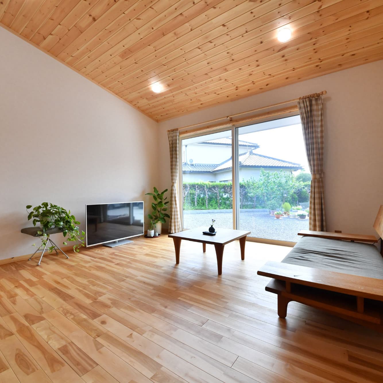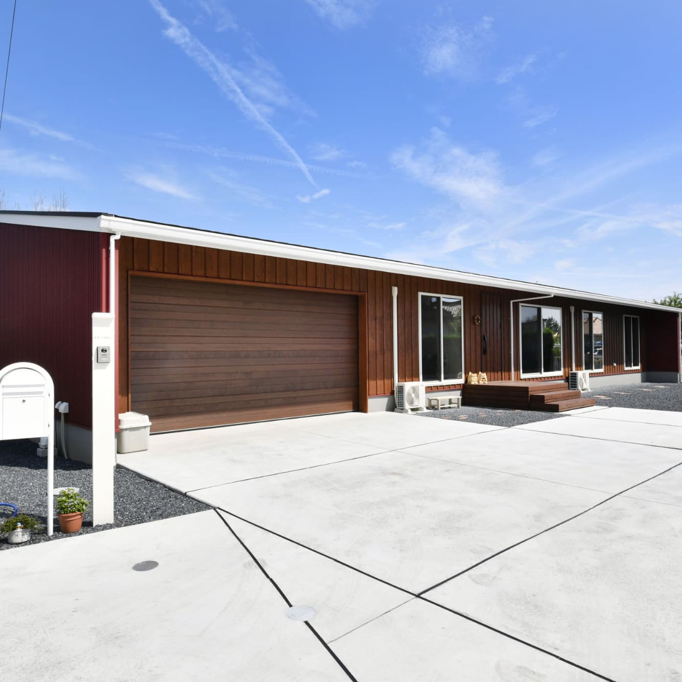 敷地に余裕があるなら、すべての部屋を南に向けて並べてみませんか?この家はガレージとリビングルーム、そして3つの寝室をシンプルに横に並べたレイアウトです。建物のカタチも単純で四角形の平面形状の上に南下がりの緩やかな屋根を掛けてます。その屋根は南に約1.3メートル程張り出しており、夏の日差しを遮り、板張り外壁の雨濡れを防ぎます。建物内部は勾配天井を採用、床と天井を無垢木材で仕上げてあります。白い壁と無垢木材の組み合わせは、シンプルでありながら天然素材の特徴である素材個々の揺らぎがあり全体として温もりを感じさせます。