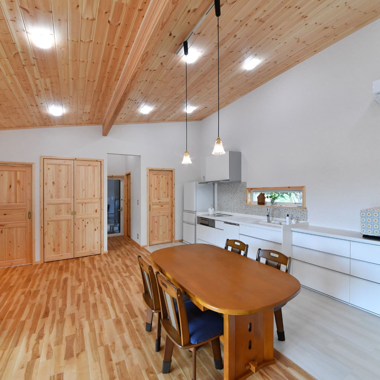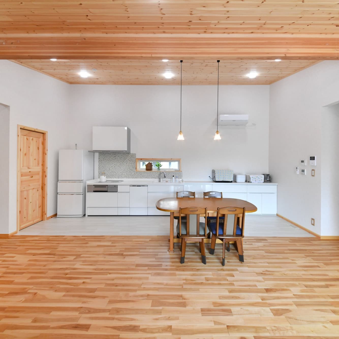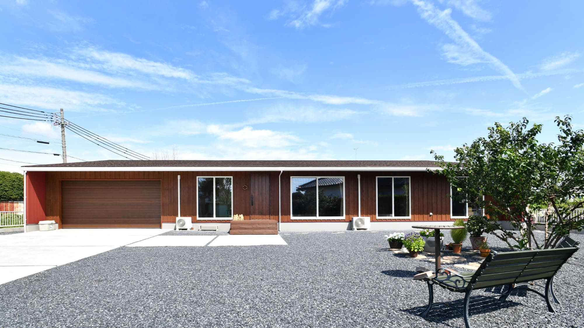敷地に余裕があるなら、すべての部屋を南に向けて並べてみませんか?この家はガレージとリビングルーム、そして3つの寝室をシンプルに横に並べたレイアウトです。建物のカタチも単純で四角形の平面形状の上に南下がりの緩やかな屋根を掛けてます。その屋根は南に約1.3メートル程張り出しており、夏の日差しを遮り、板張り外壁の雨濡れを防ぎます。建物内部は勾配天井を採用、床と天井を無垢木材で仕上げてあります。白い壁と無垢木材の組み合わせは、シンプルでありながら天然素材の特徴である素材個々の揺らぎがあり全体として温もりを感じさせます。