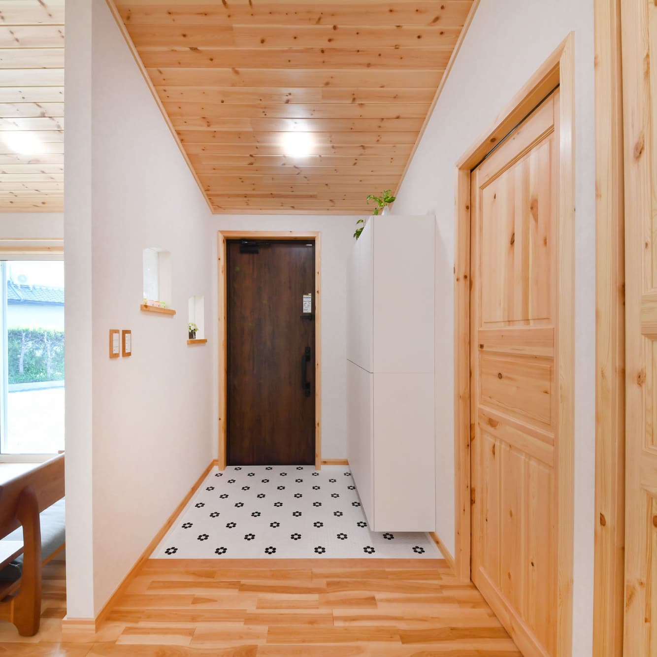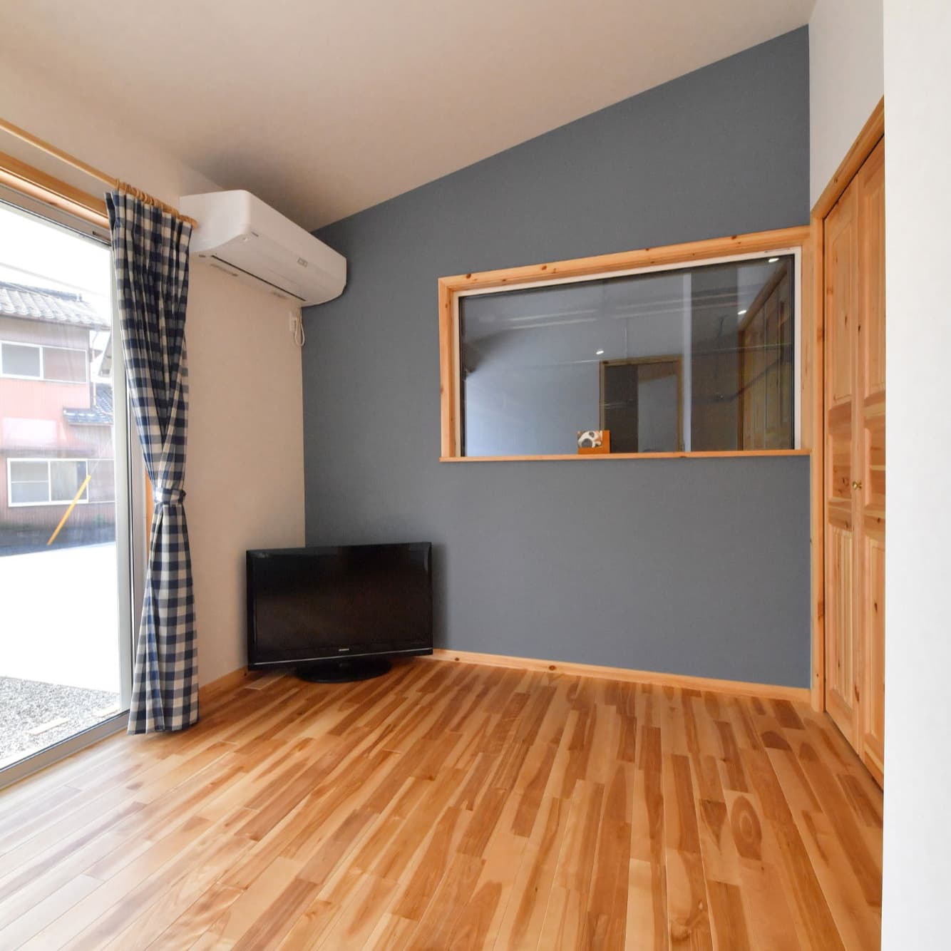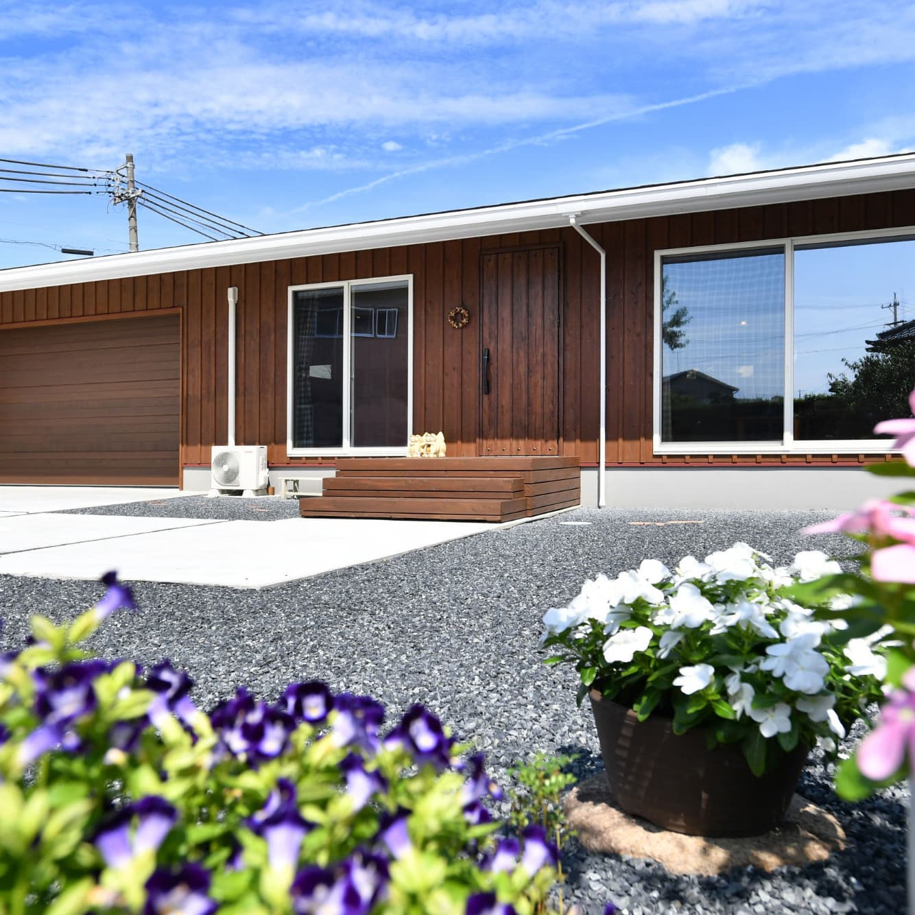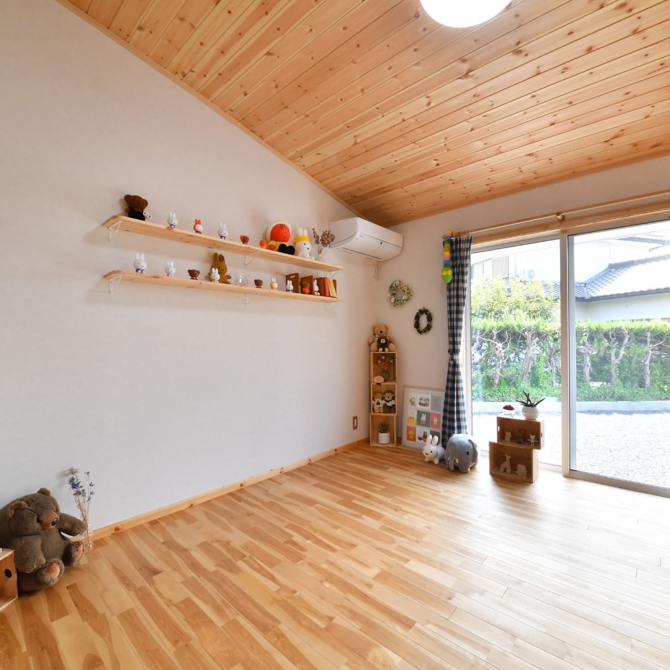 敷地に余裕があるなら、すべての部屋を南に向けて並べてみませんか?この家はガレージとリビングルーム、そして3つの寝室をシンプルに横に並べたレイアウトです。建物のカタチも単純で四角形の平面形状の上に南下がりの緩やかな屋根を掛けてます。その屋根は南に約1.3メートル程張り出しており、夏の日差しを遮り、板張り外壁の雨濡れを防ぎます。建物内部は勾配天井を採用、床と天井を無垢木材で仕上げてあります。白い壁と無垢木材の組み合わせは、シンプルでありながら天然素材の特徴である素材個々の揺らぎがあり全体として温もりを感じさせます。