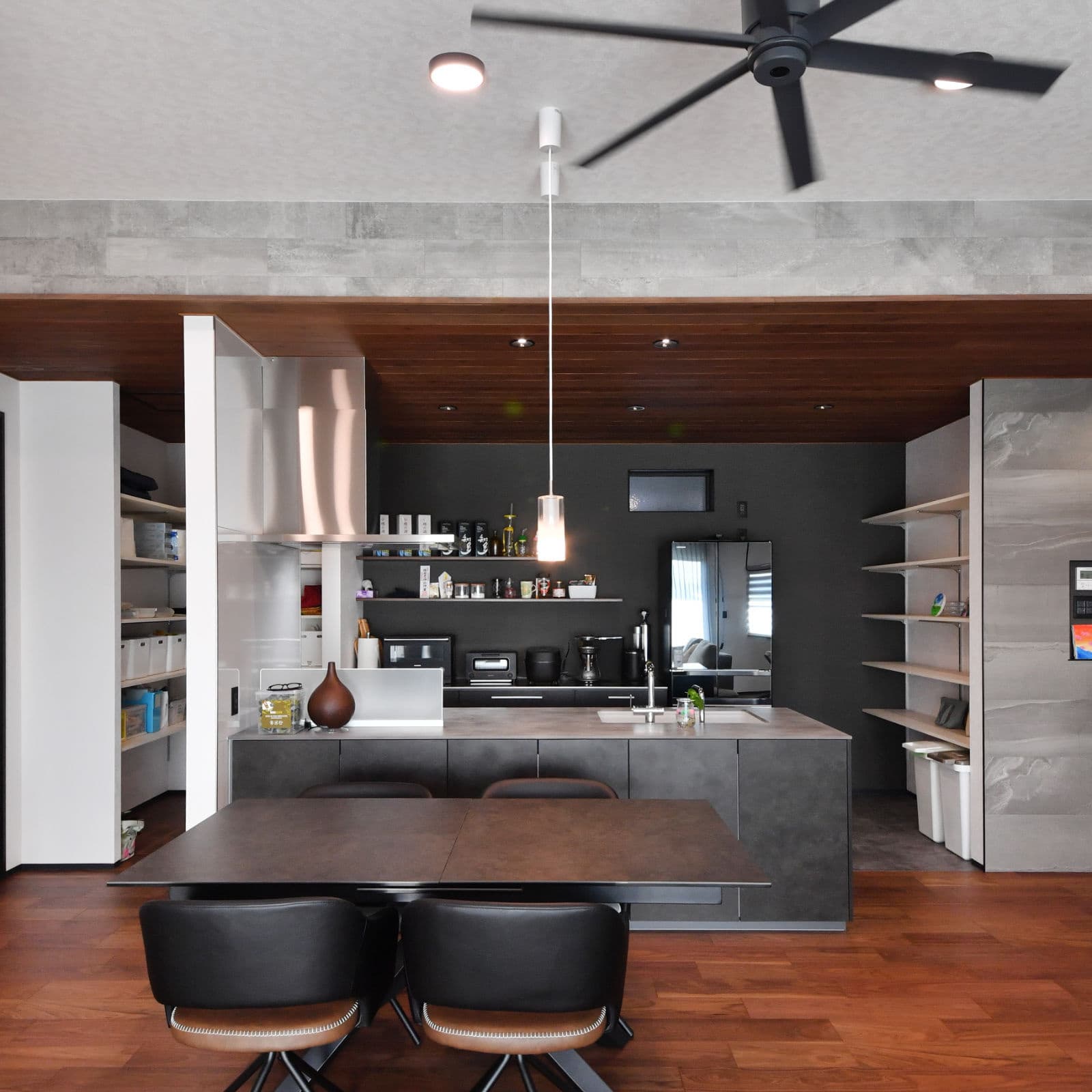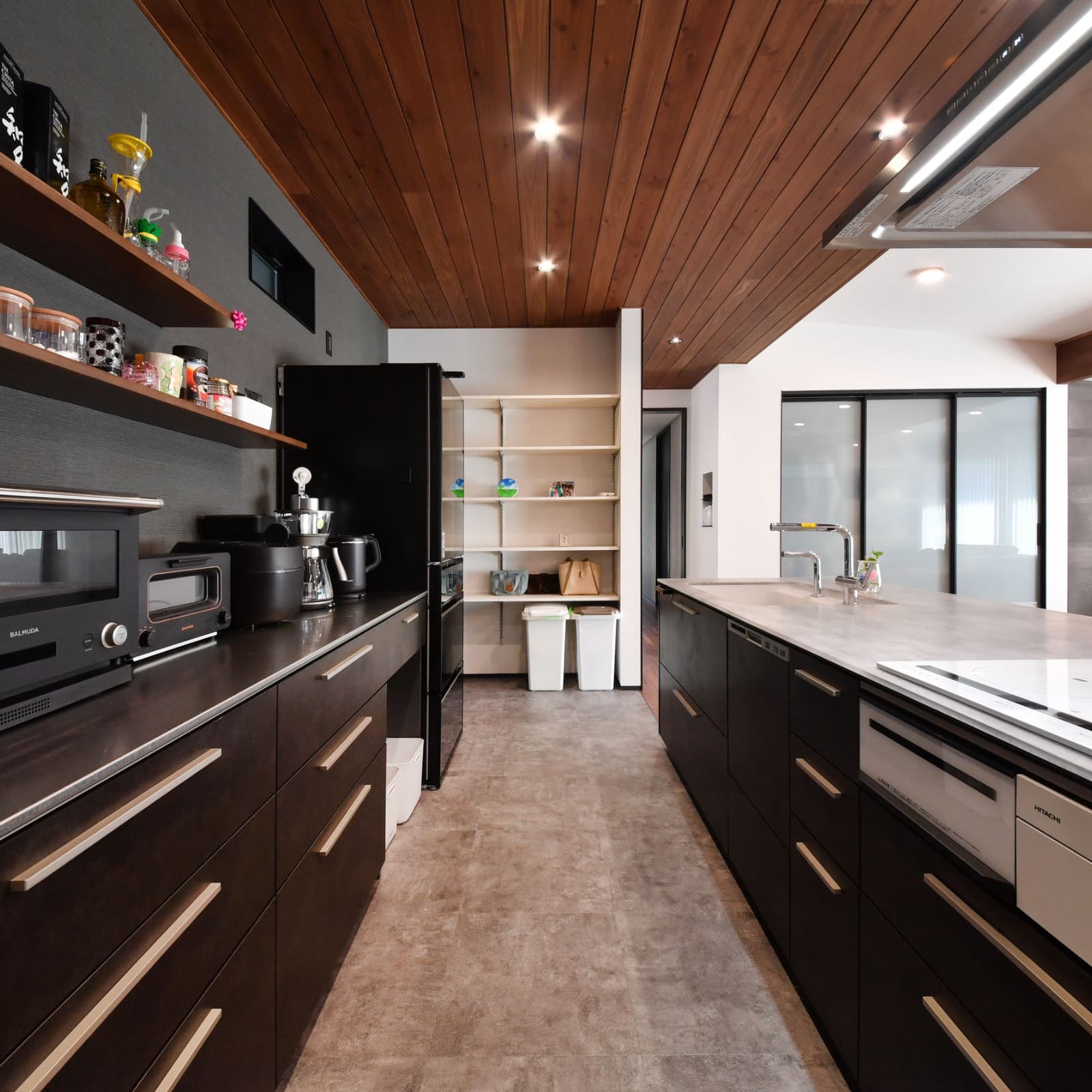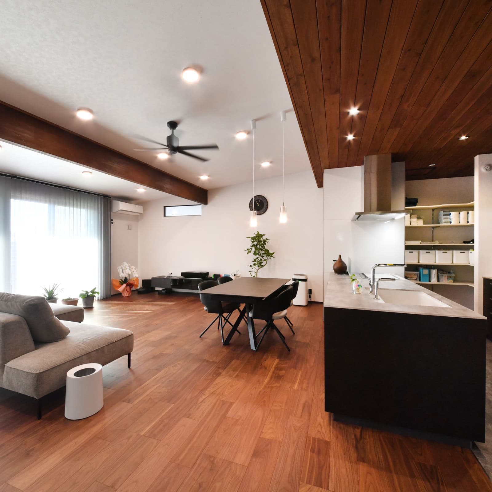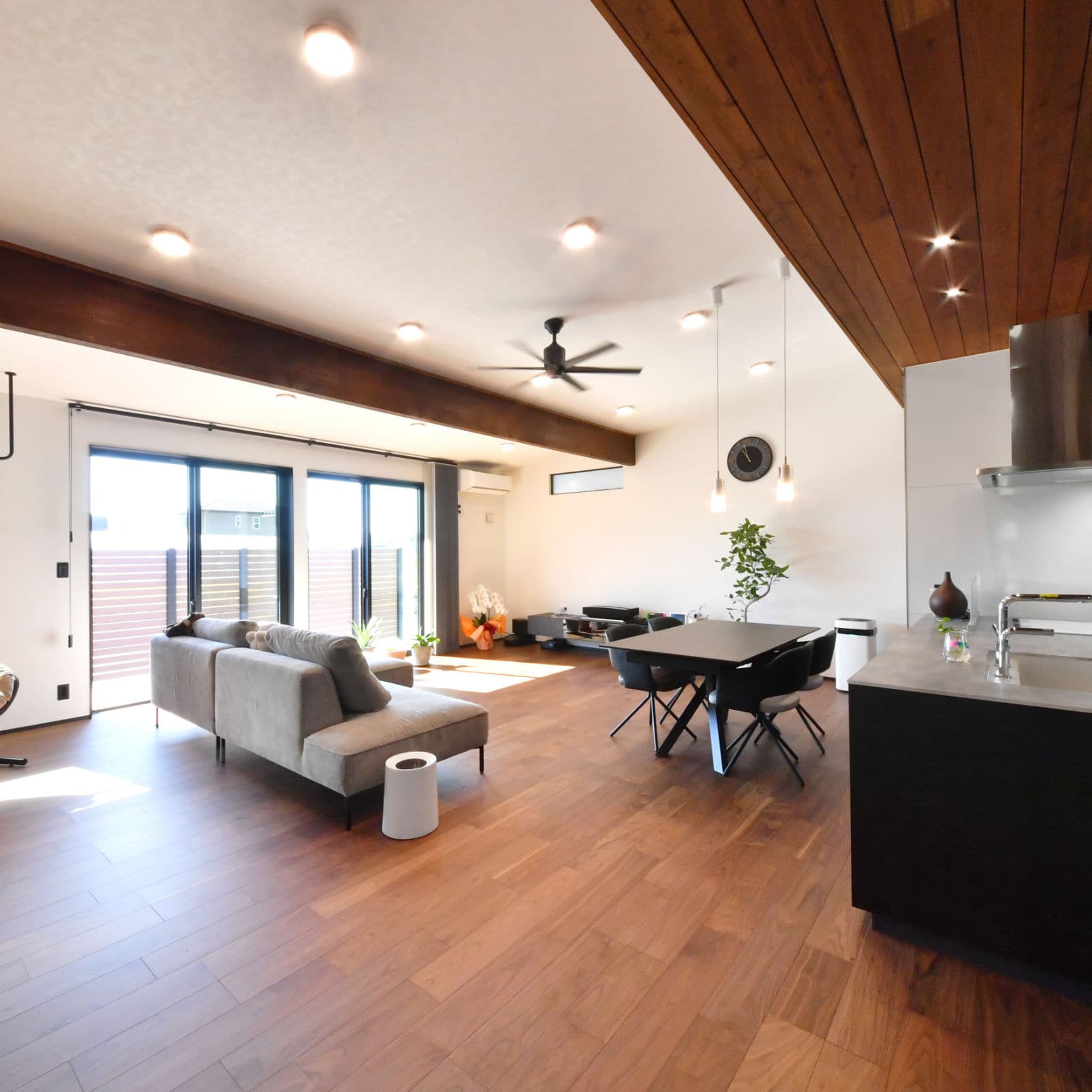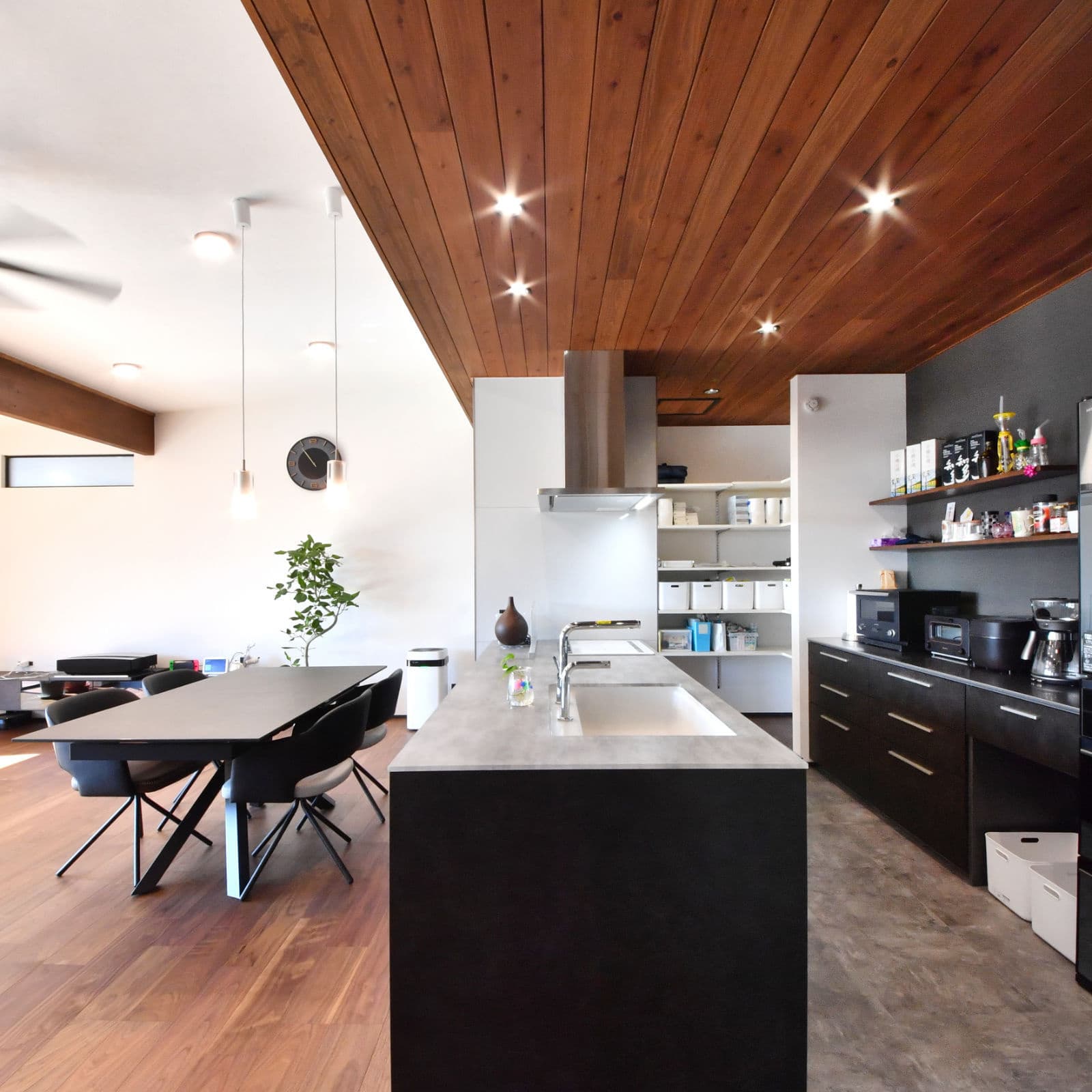 6台収納できるビルトインガレージと30畳を超えるリビングルームが条件でした。設計では、建物のカタチと構造をシンプルにすることでコストを抑えつつ絶対的な広さを追求しました。ただ広いだけでは単調になりがちです。そこで梁をあらわしたうえで勾配天井を取り入れ、ウォルナットなど暗褐色系の素材をアクセントとして施すことでChicでModarnな雰囲気に仕上げました。
