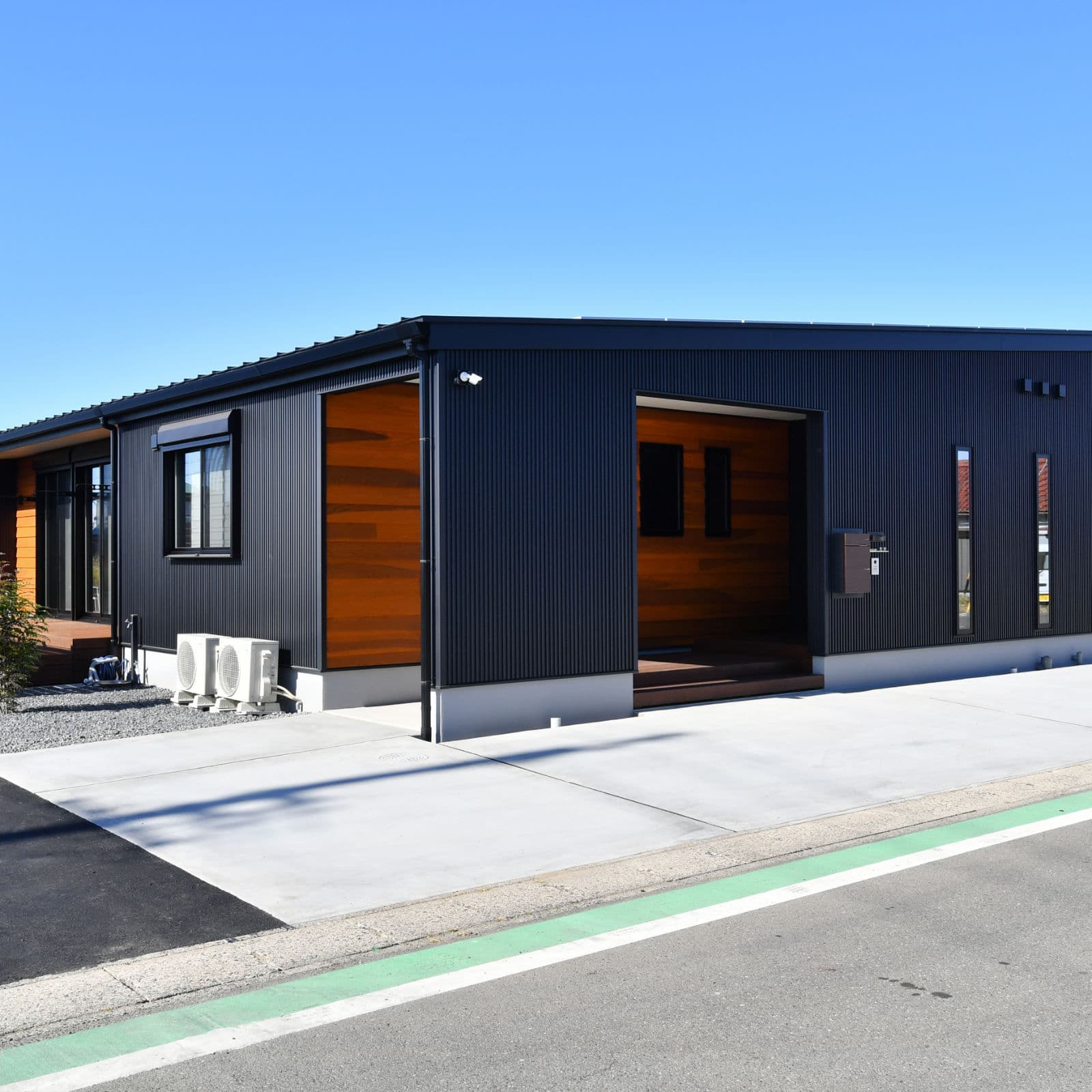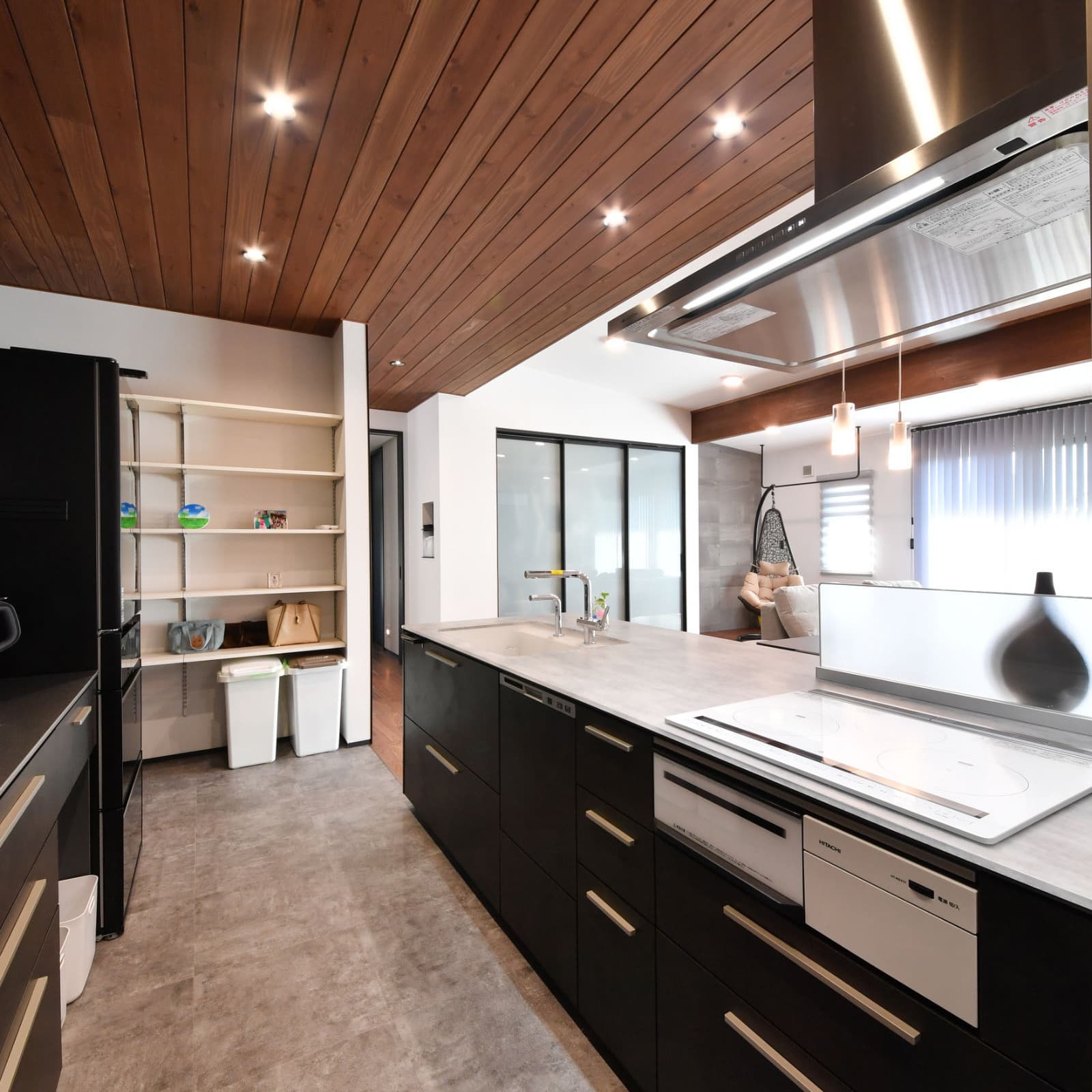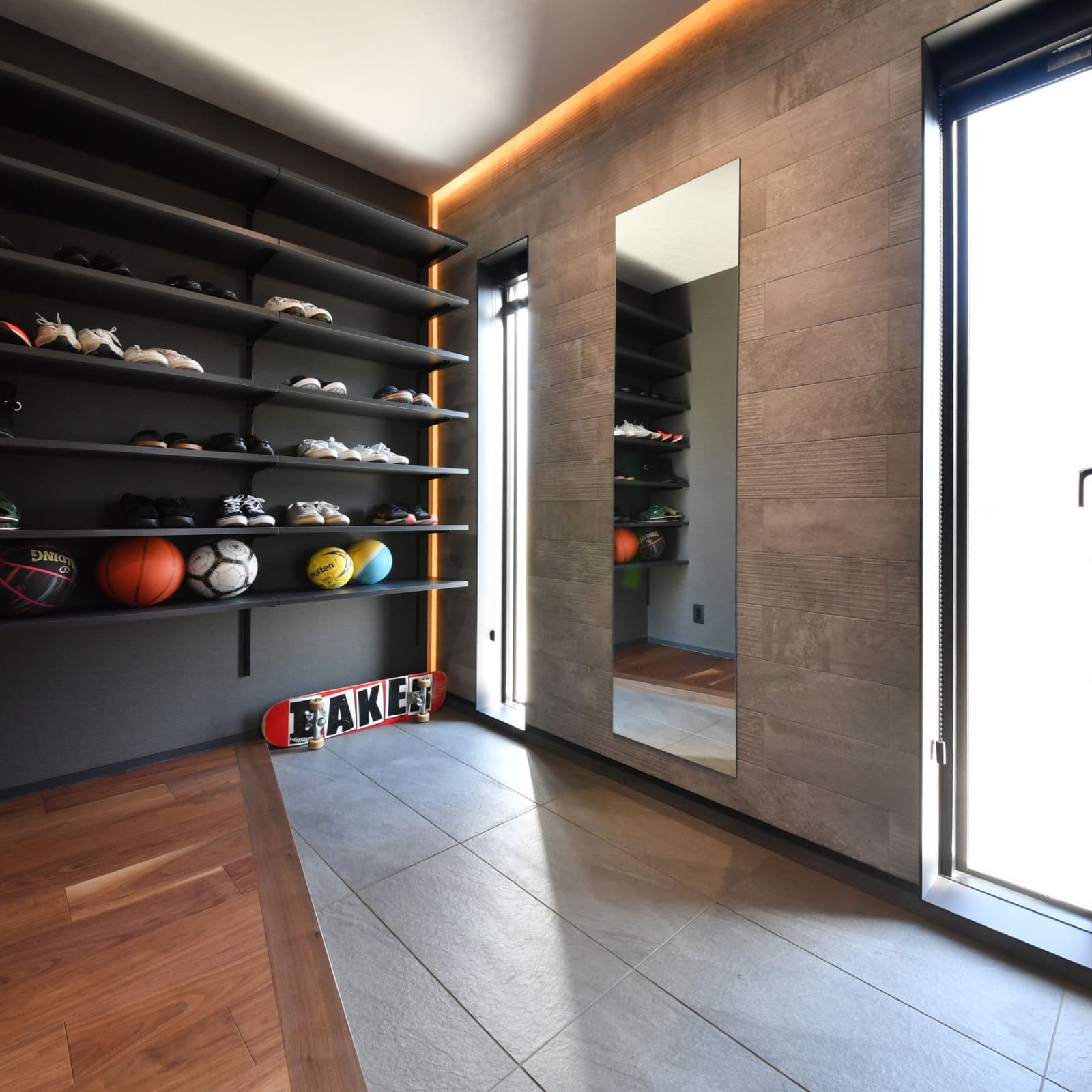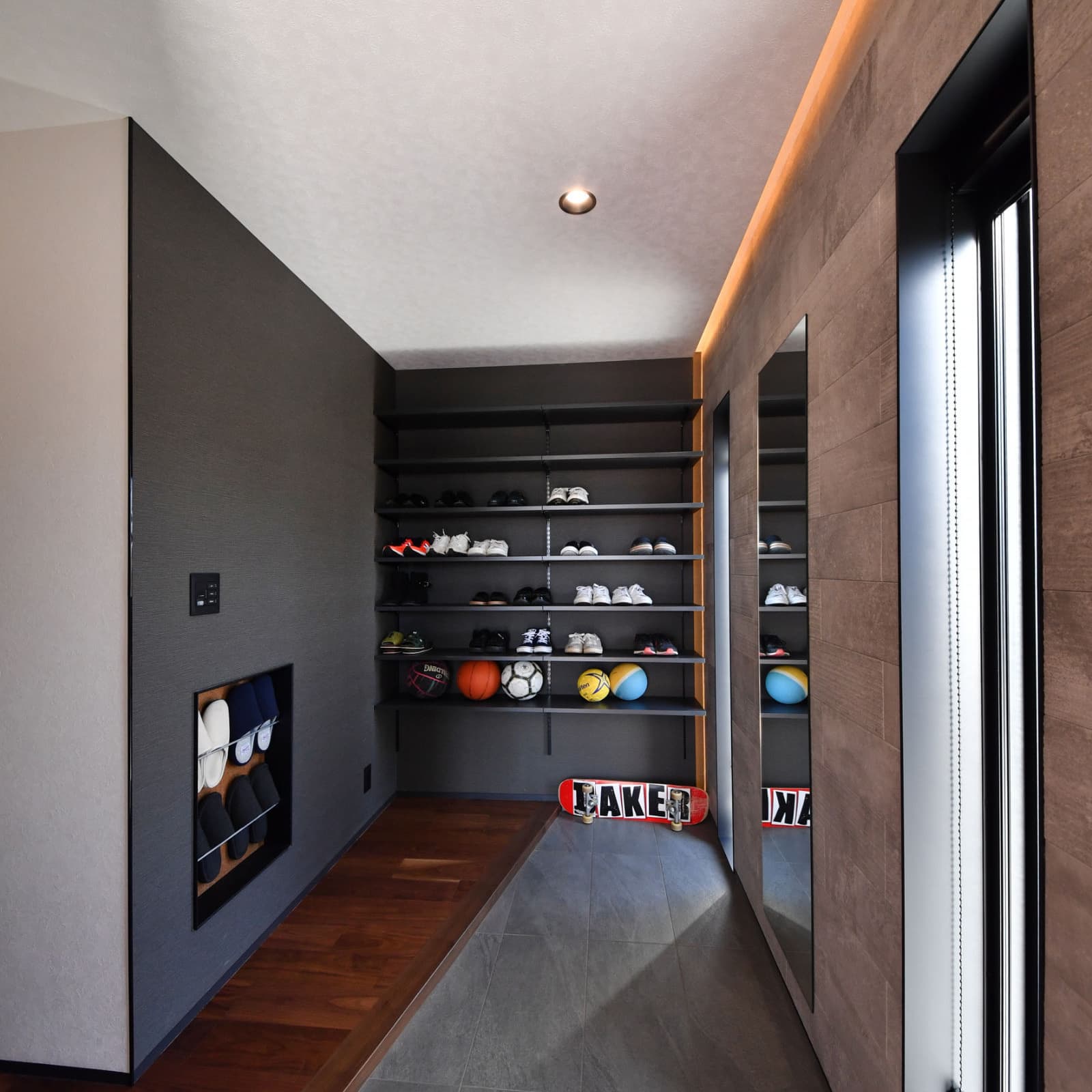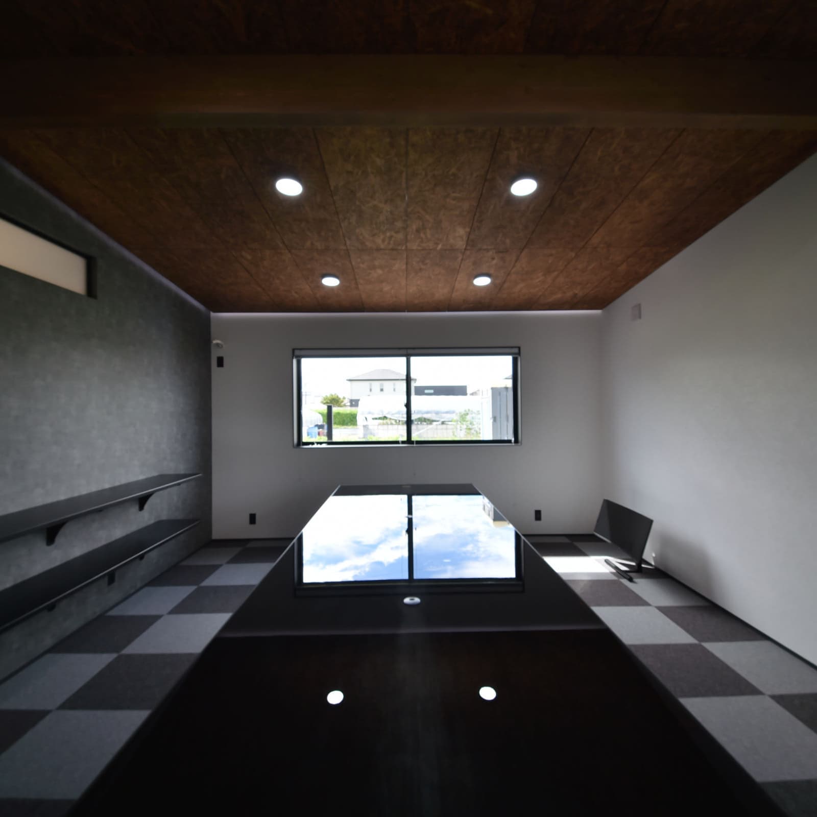 6台収納できるビルトインガレージと30畳を超えるリビングルームが条件でした。設計では、建物のカタチと構造をシンプルにすることでコストを抑えつつ絶対的な広さを追求しました。ただ広いだけでは単調になりがちです。そこで梁をあらわしたうえで勾配天井を取り入れ、ウォルナットなど暗褐色系の素材をアクセントとして施すことでChicでModarnな雰囲気に仕上げました。