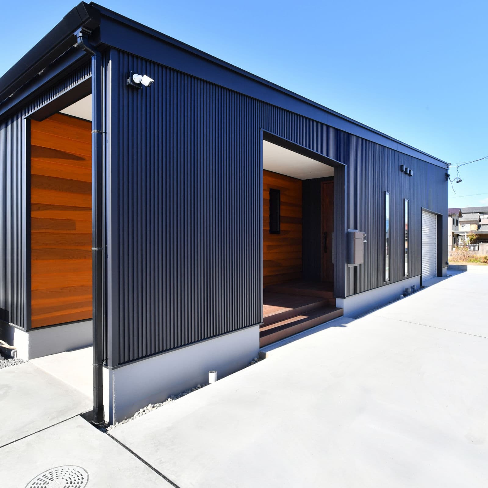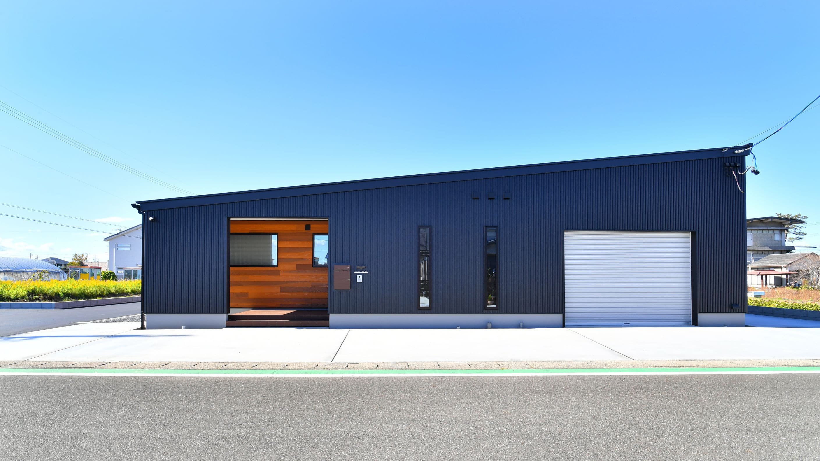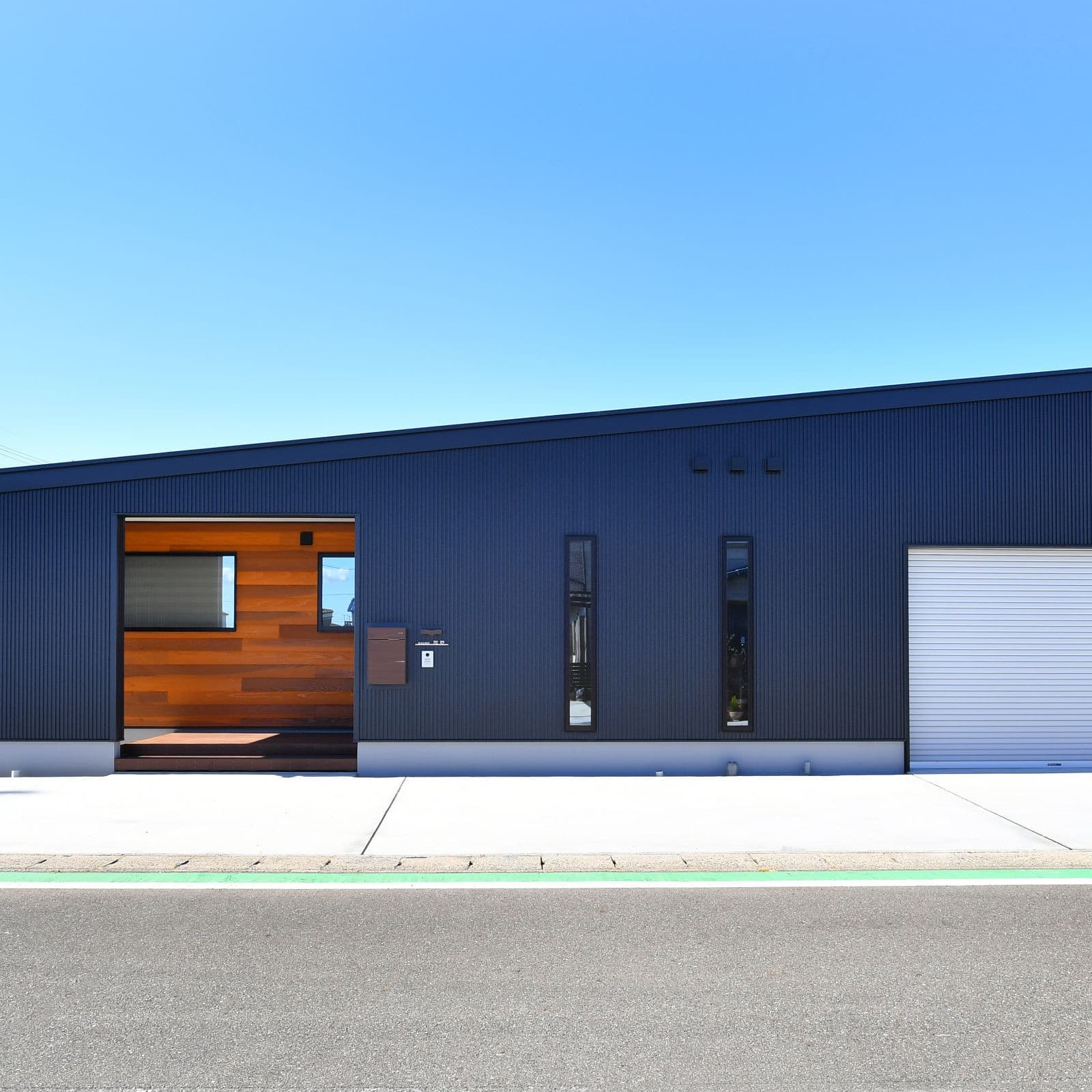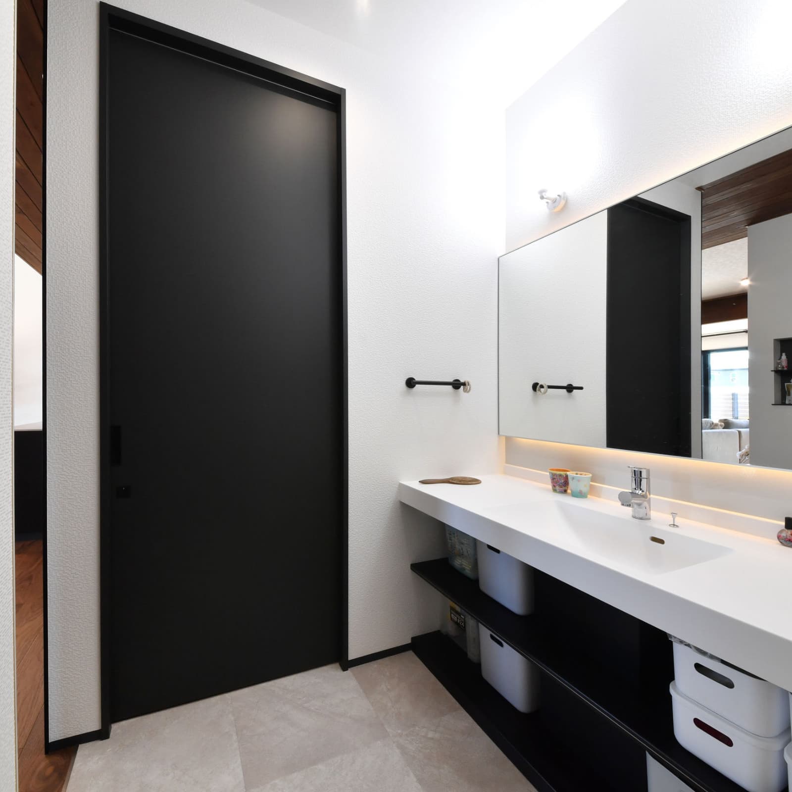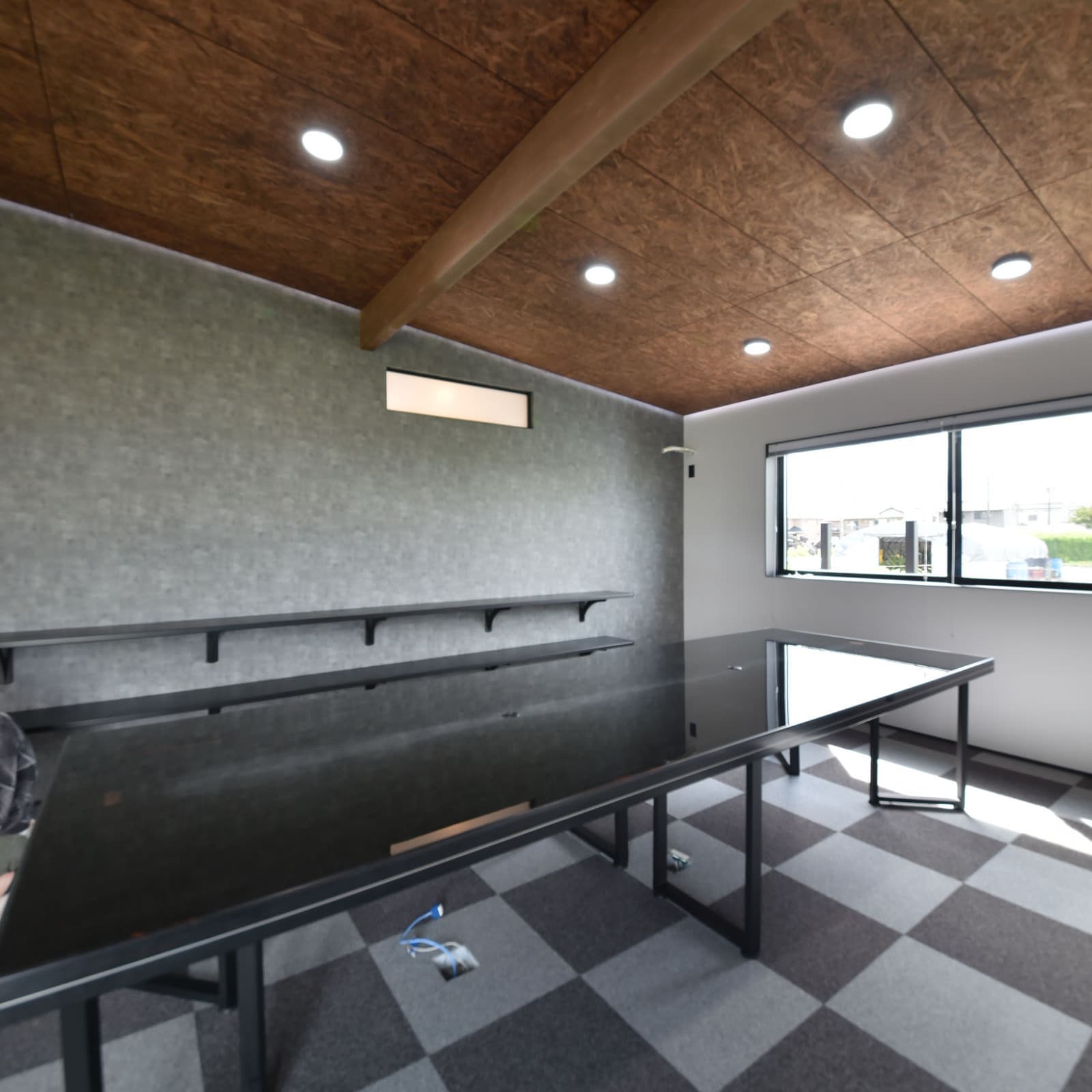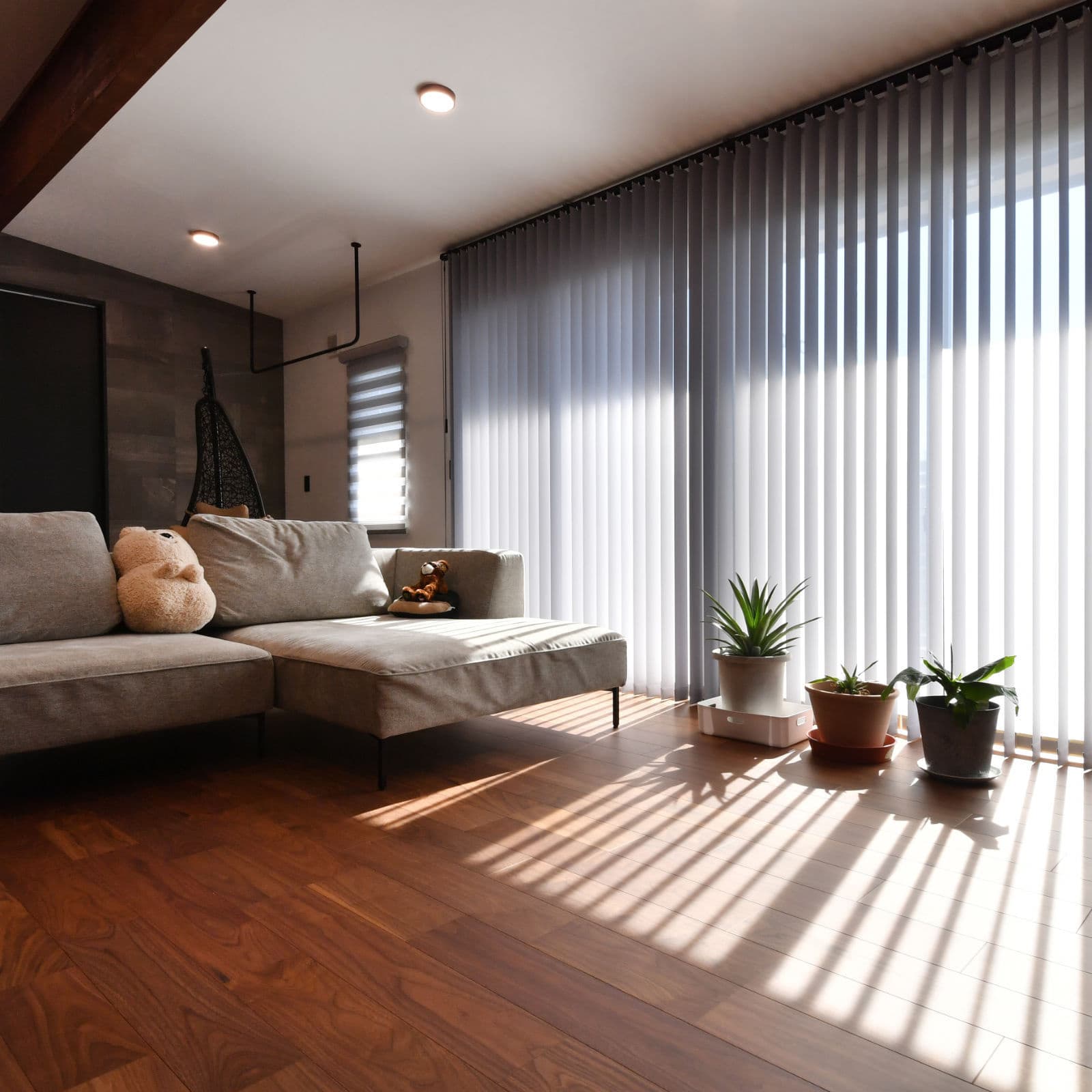 6台収納できるビルトインガレージと30畳を超えるリビングルームが条件でした。設計では、建物のカタチと構造をシンプルにすることでコストを抑えつつ絶対的な広さを追求しました。ただ広いだけでは単調になりがちです。そこで梁をあらわしたうえで勾配天井を取り入れ、ウォルナットなど暗褐色系の素材をアクセントとして施すことでChicでModarnな雰囲気に仕上げました。