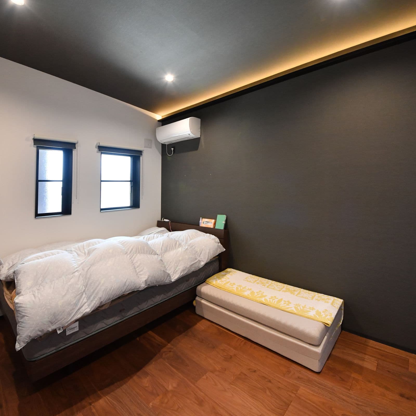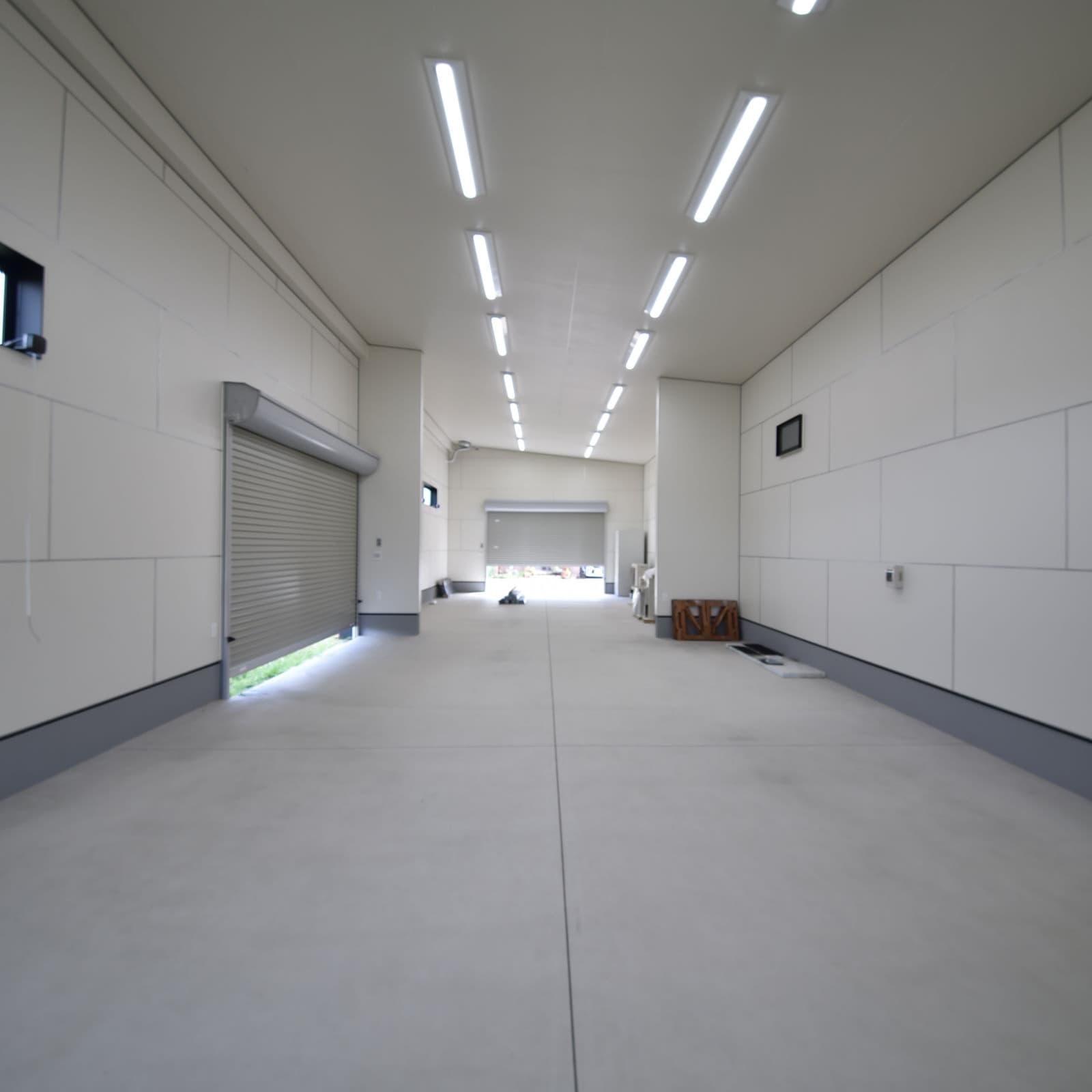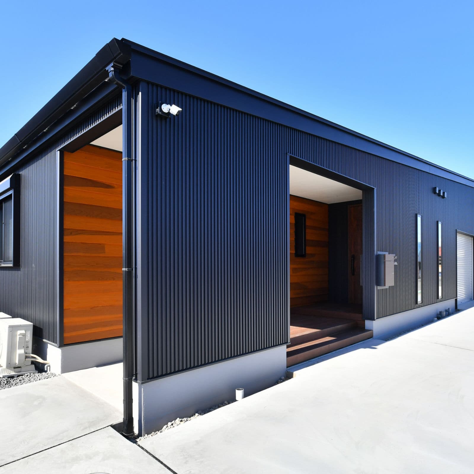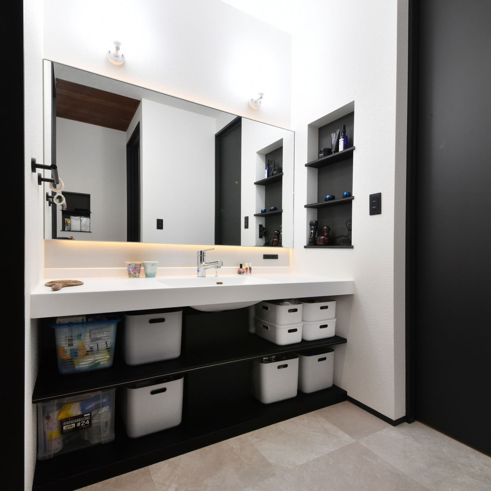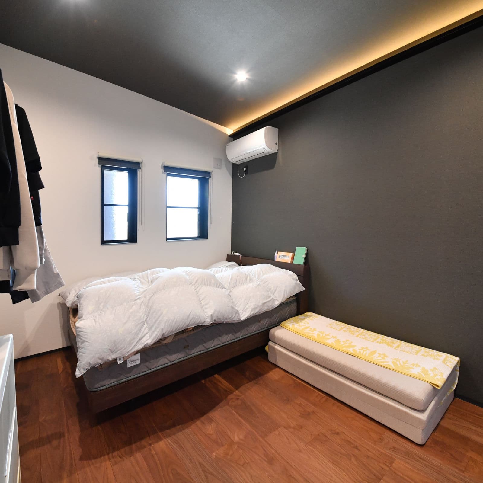 6台収納できるビルトインガレージと30畳を超えるリビングルームが条件でした。設計では、建物のカタチと構造をシンプルにすることでコストを抑えつつ絶対的な広さを追求しました。ただ広いだけでは単調になりがちです。そこで梁をあらわしたうえで勾配天井を取り入れ、ウォルナットなど暗褐色系の素材をアクセントとして施すことでChicでModarnな雰囲気に仕上げました。