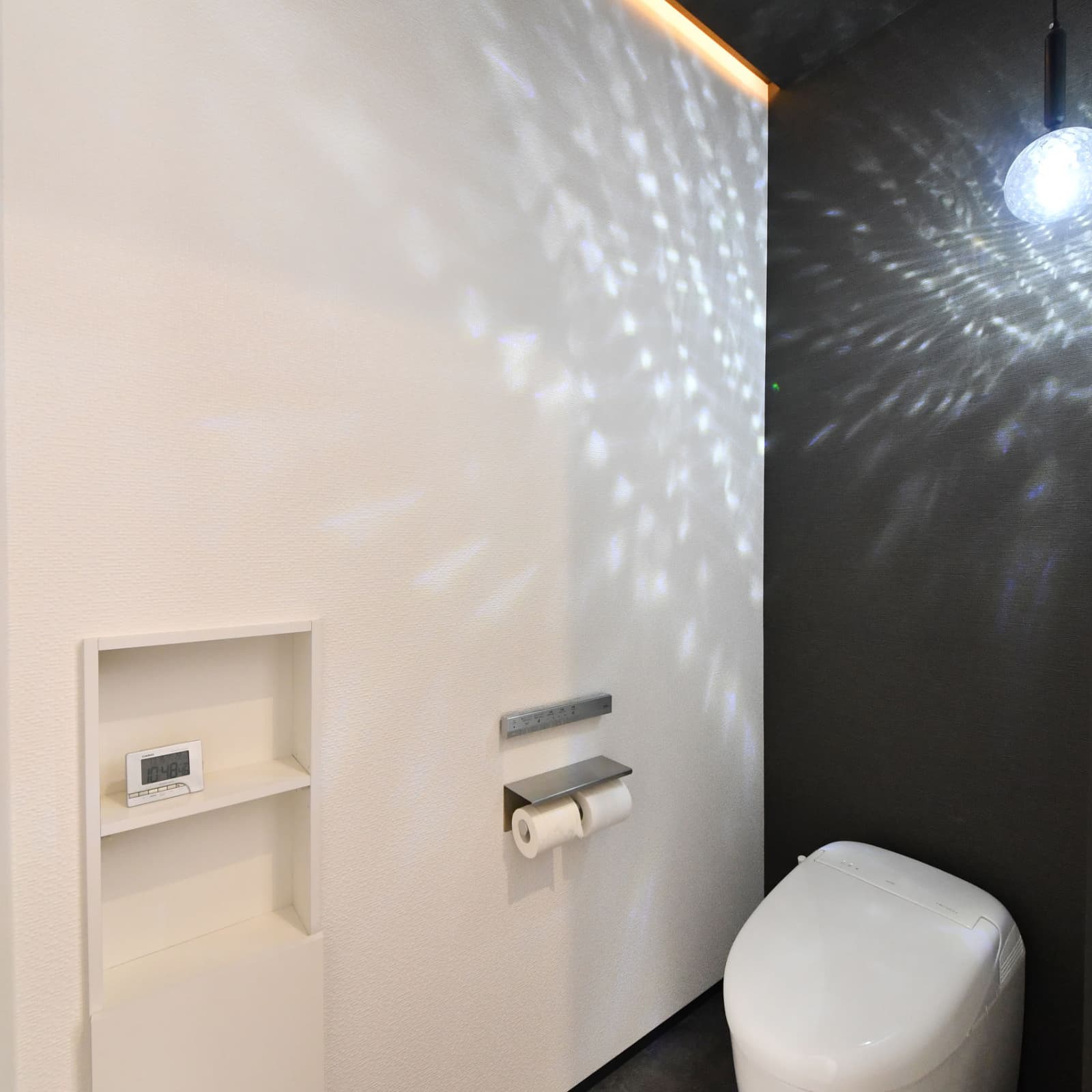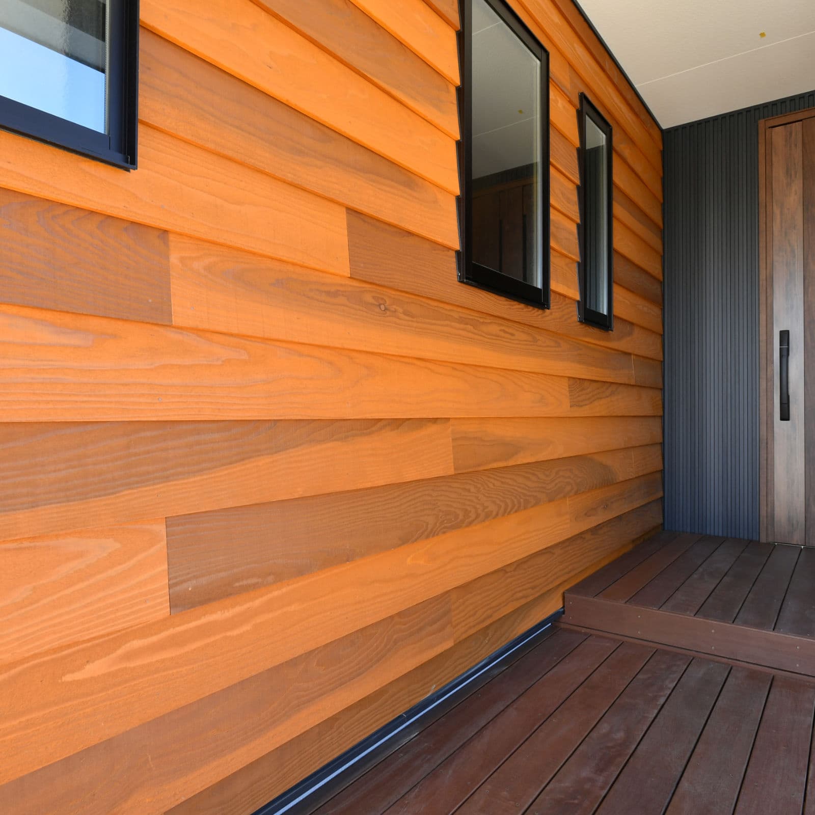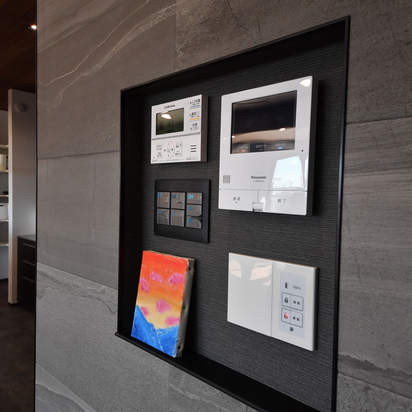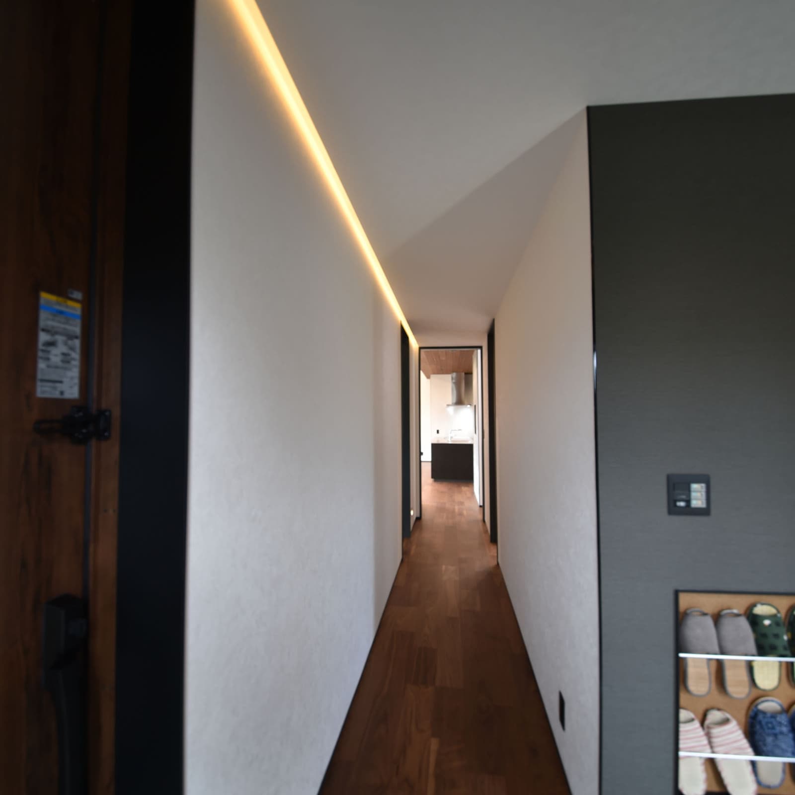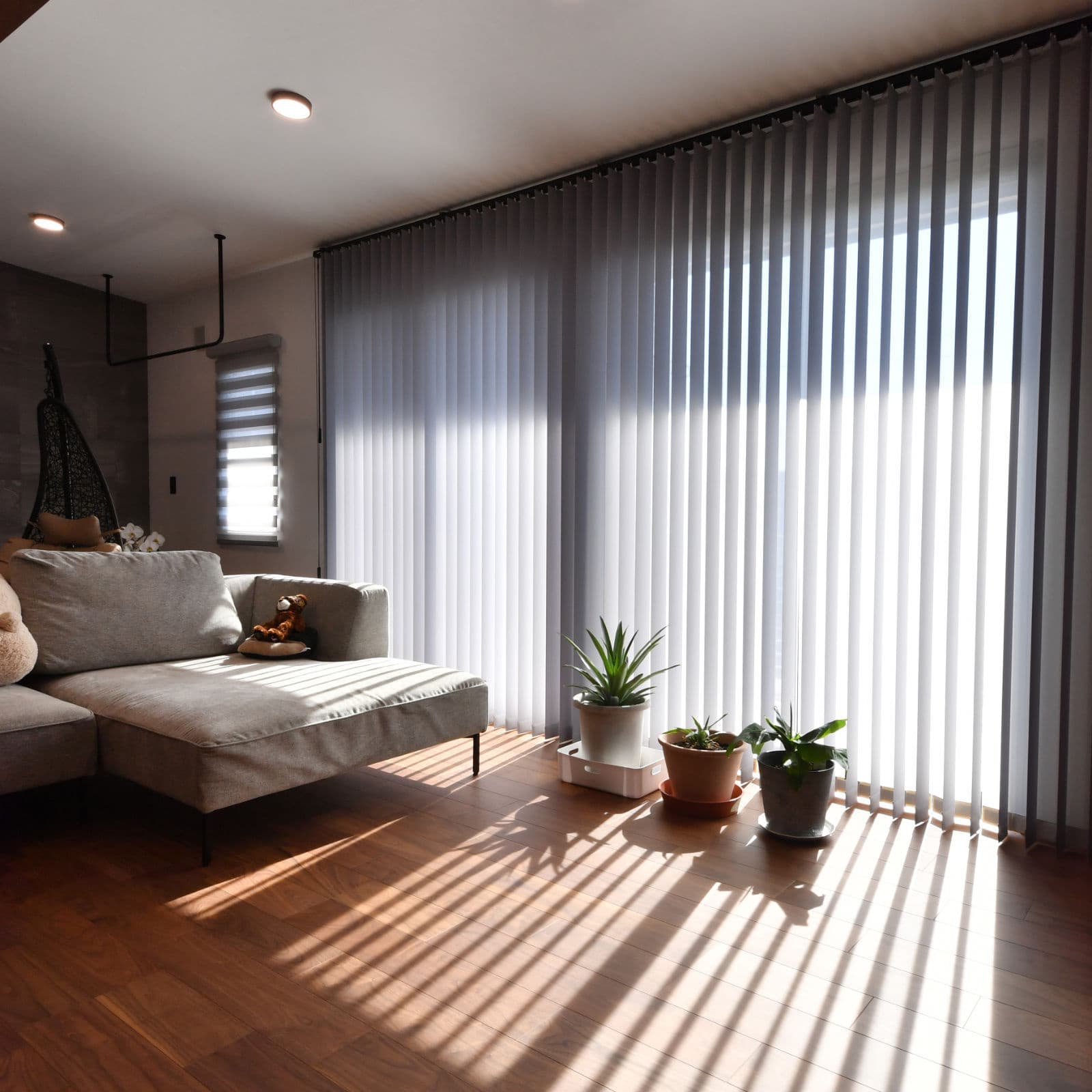 6台収納できるビルトインガレージと30畳を超えるリビングルームが条件でした。設計では、建物のカタチと構造をシンプルにすることでコストを抑えつつ絶対的な広さを追求しました。ただ広いだけでは単調になりがちです。そこで梁をあらわしたうえで勾配天井を取り入れ、ウォルナットなど暗褐色系の素材をアクセントとして施すことでChicでModarnな雰囲気に仕上げました。